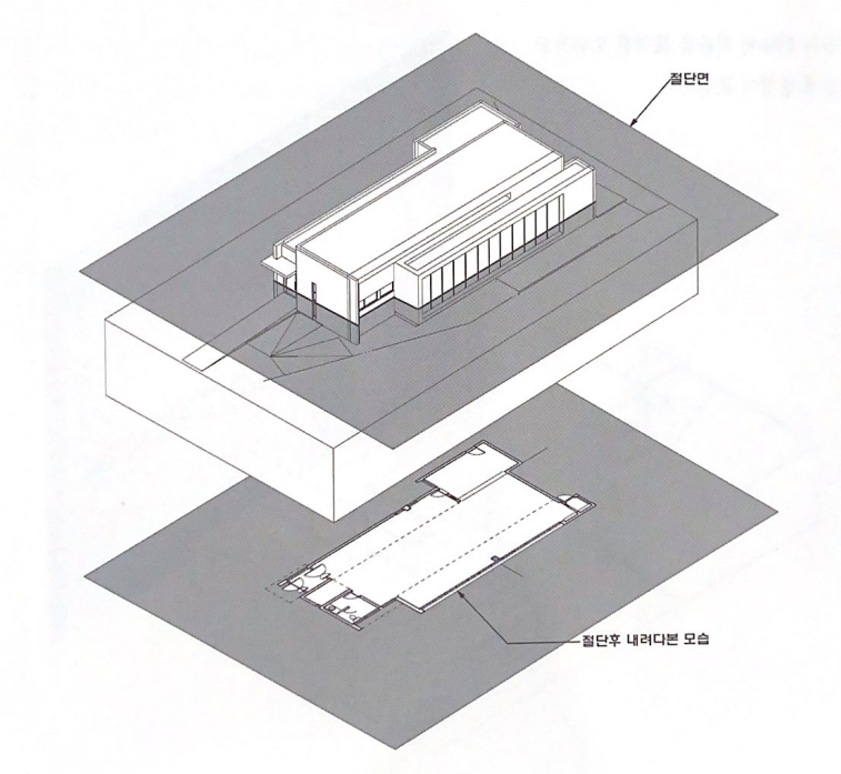 건물을 수직으로 자른 도면으로 각 층의 수직 레벨과 내부 및 외부 마감재의 구성을 표현하는 도면으로 단면도를 그리기 위해서는 절단되는 위치를 먼저 결정해야 하며, 이 절단선은 평면도 상에 굵은 1점 쇄선으로 표시한다.