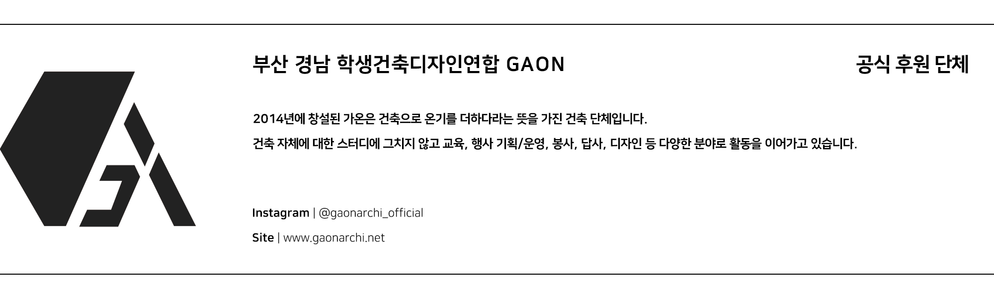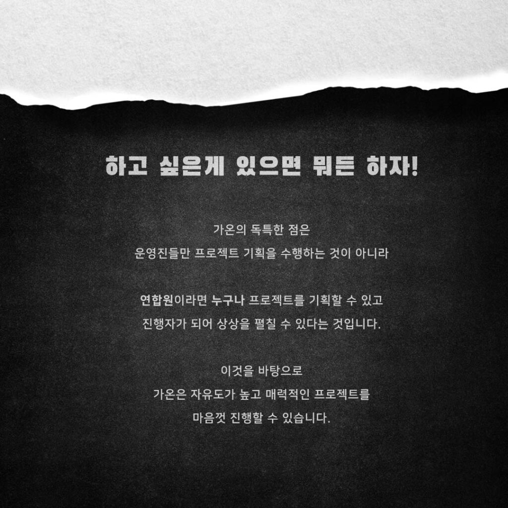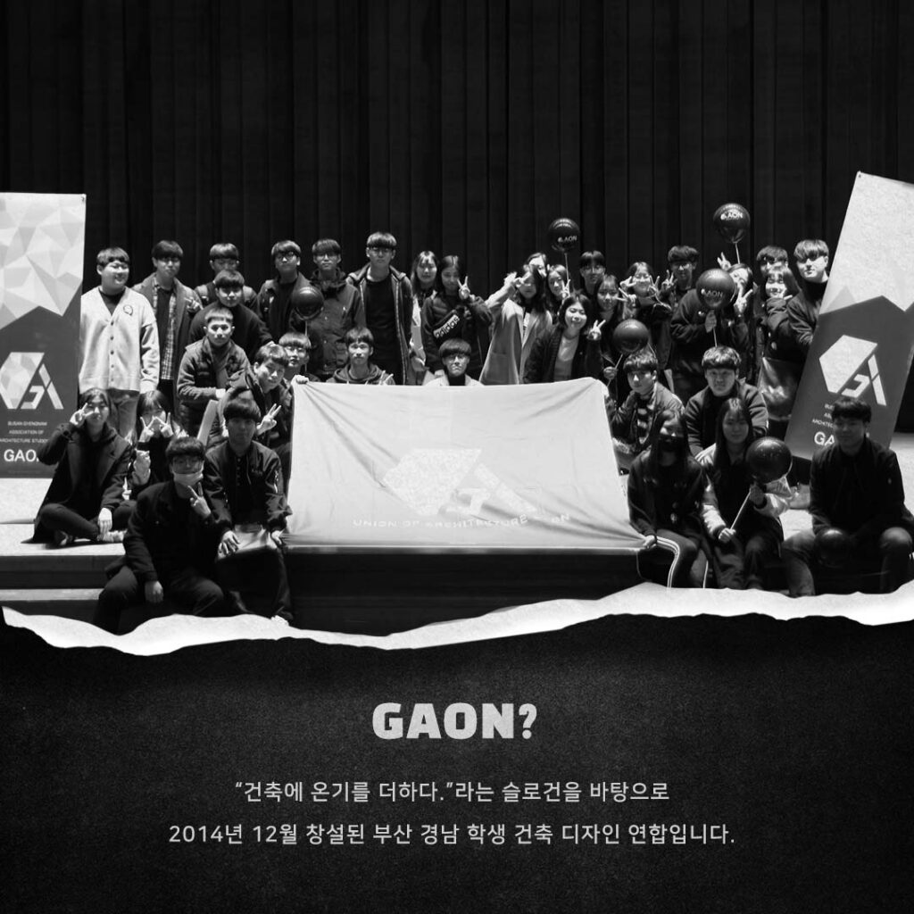 건축과 디자인에는 도출된 형태는 있지만 정해진 정답은 없습니다. 접근하는 사람마다 가지고 있는 다양성이 다르기 때문이죠. 어떠한 배경을 가지고 어떠한 시선으로 생각하냐에 따라 건축과 디자인은 끝없이 변화시킬 수 있습니다. 저희 가온은 이러한 건축과 디자인에 대한 다양성을 존중하고 변화에 대한 가능성을 통해 꿈과 열정을 이루고자 하는 부산, 경남지역의 학생단체 입니다. 건축 디자인, 탐방, 스터디, 모형제작에서부터 시공, 워크숍, 전시회, 엑스포 등 건축과 디자인으로 할 수 있는 것이라면 무엇이든 새롭게 다가서고자 하며 다른 학생단체나 조직, 기업과 함께 콜라보레이션하여 여러분의 꿈에 열정에 다가갈 수 있는 색다른 활동들을 경험하실 수 있습니다.