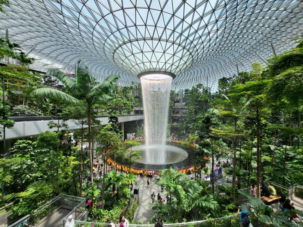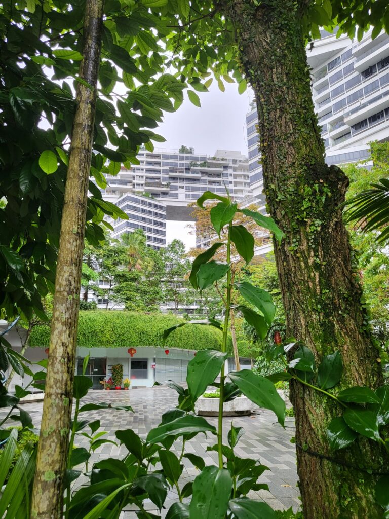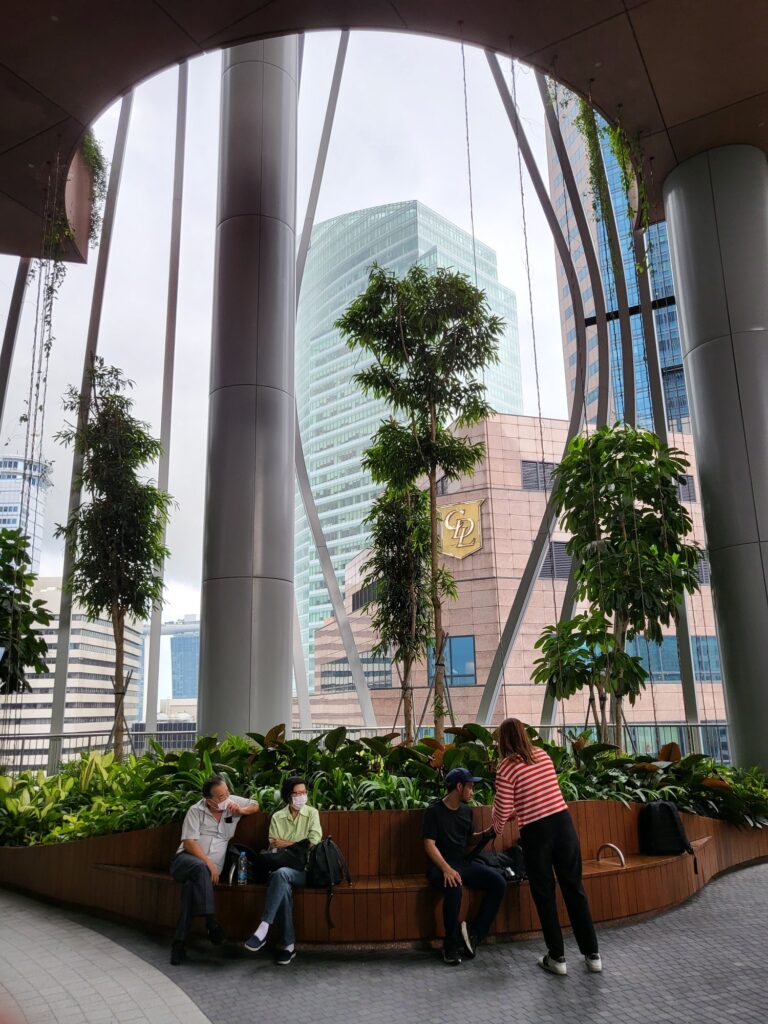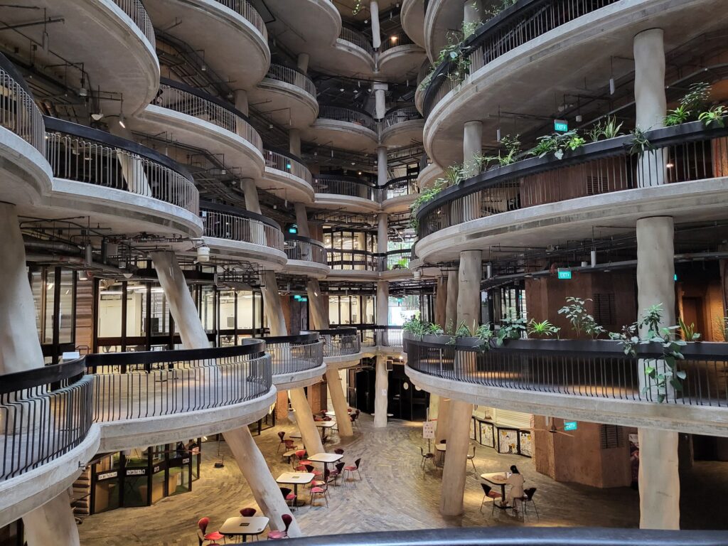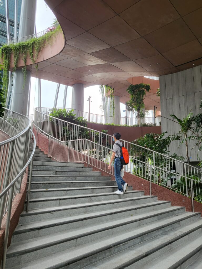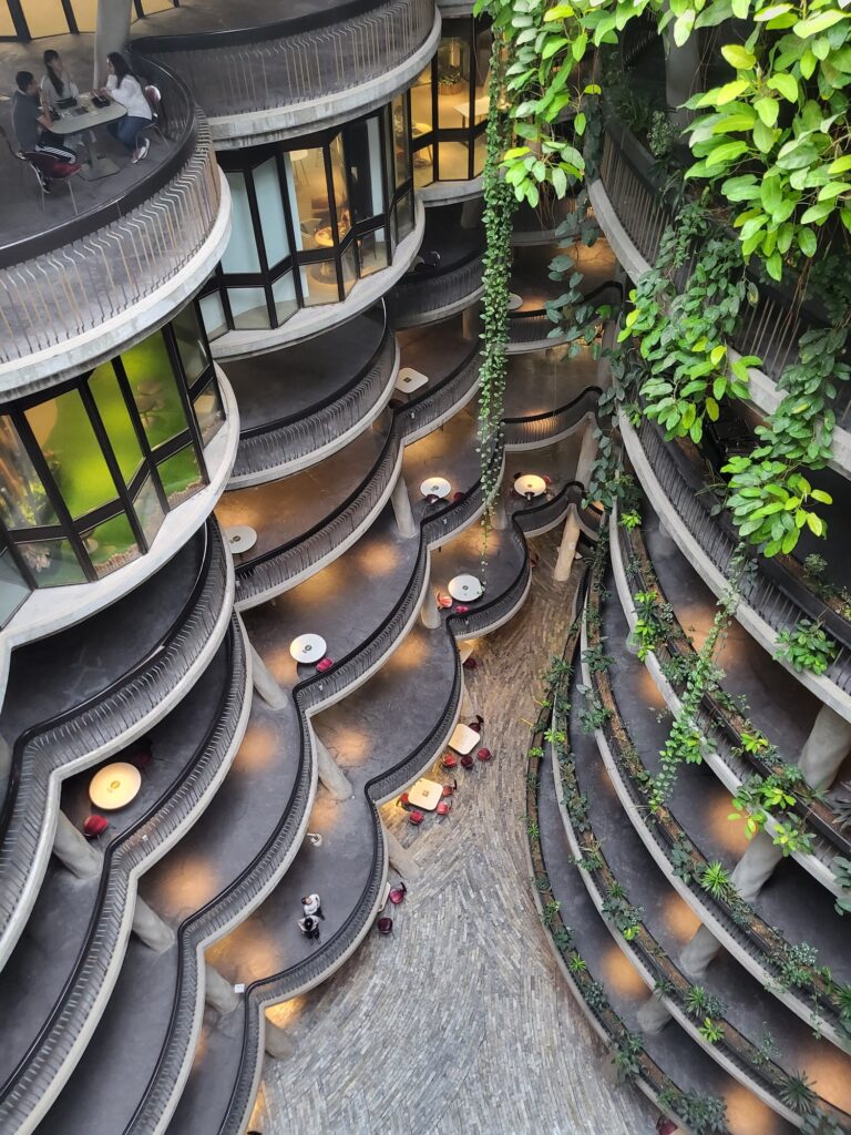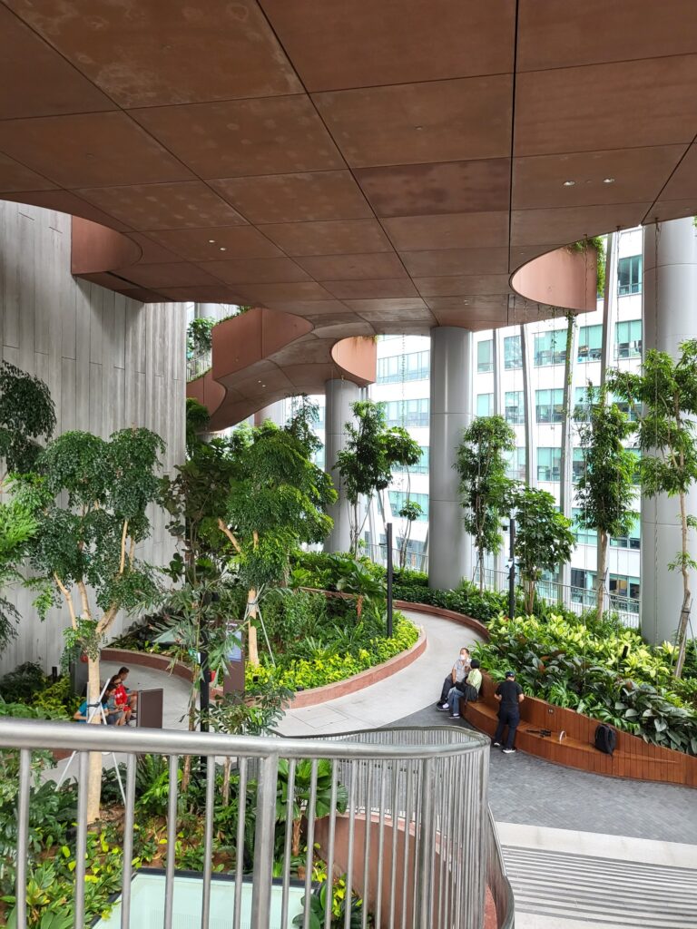먼저 보여드릴 공간은 17-19층에 있는 중정인데요. 건축물 자체적으로 매우 높은 층고를 가지고 있고 약 3개의 높은 층고를 가진 층이 가운데 코어를 제외하고 모든 공간을 중정으로 형성되어 있어 공원을 걷는 느낌이 들었습니다. 싱가포르 식물의 높게 우리나라의 식물보다 높게 자라고 스케일이 크게 자라기 때문에 중정의 웅장함은 배로 느껴졌습니다.