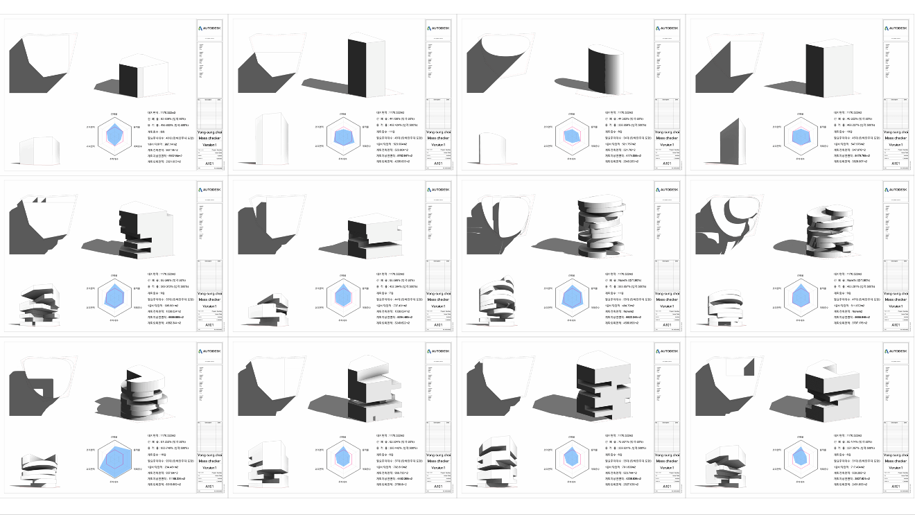 A : 그때도 똑같은 일을 했었어요. 레빗은 원래 사용하고 있었고 유학 준비했었을 때 논문을 냈던 게 컴퓨테이션 디자인을 제안했었거든요. 대규모든 소규모 건축주든 이 사람들은 자기 돈 전 재산 10억 20억 100억짜리 제안을 한단 말이에요. 나는 이걸로 건물을 짓고 싶은데 설계사무소에 있는 소장님들이나 디자인을 낼 수 있는 한계가 있어요. 본인들이 익숙한 디자인과 요소들을 사용한단 말이에요. 커튼월 입면이나 상세 디자인이나 그런 것들을 자기가 그려왔던 것들이 익숙하고 편하고 빠르니까 사용하는데 의뢰하는 사람들은 그거를 바라지 않았을 거라고 생각하거든요.