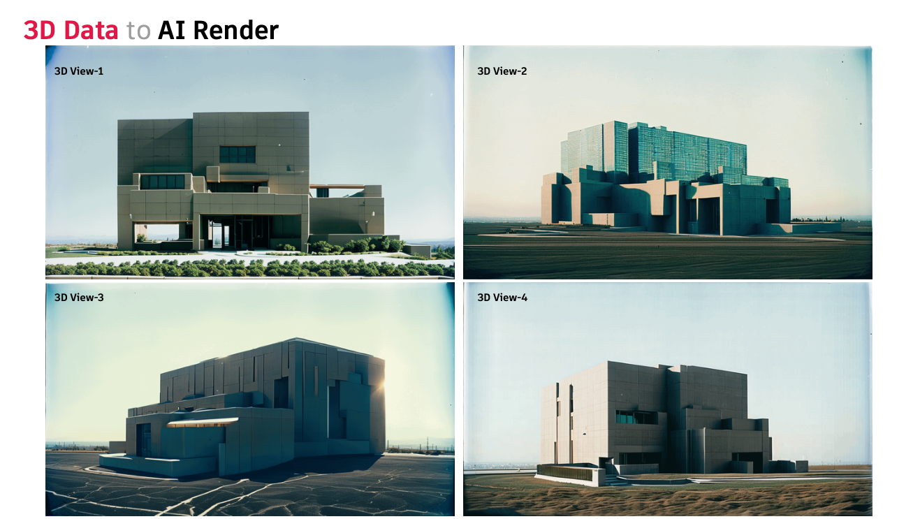 무료로 공개가 되어있는 것들을 가져다 쓰는 거예요. 그렇게 해서 기본적인 게 모두 결정되고 나면 이게 입면의 최종이 아니거든요. 요즘에는 AI 툴이 아주 많아서 애드온을 하나 받아서 그걸로 계속 디자인 렌더를 돌려서 그중에서 하나 정해서 좀 더 디테일하게 결정해 나가면서 마무리했어요.