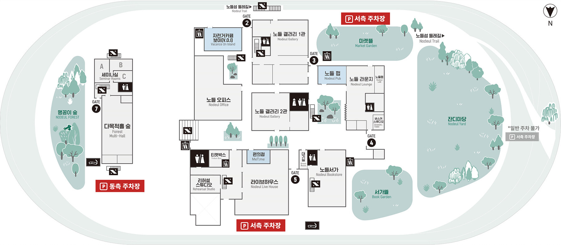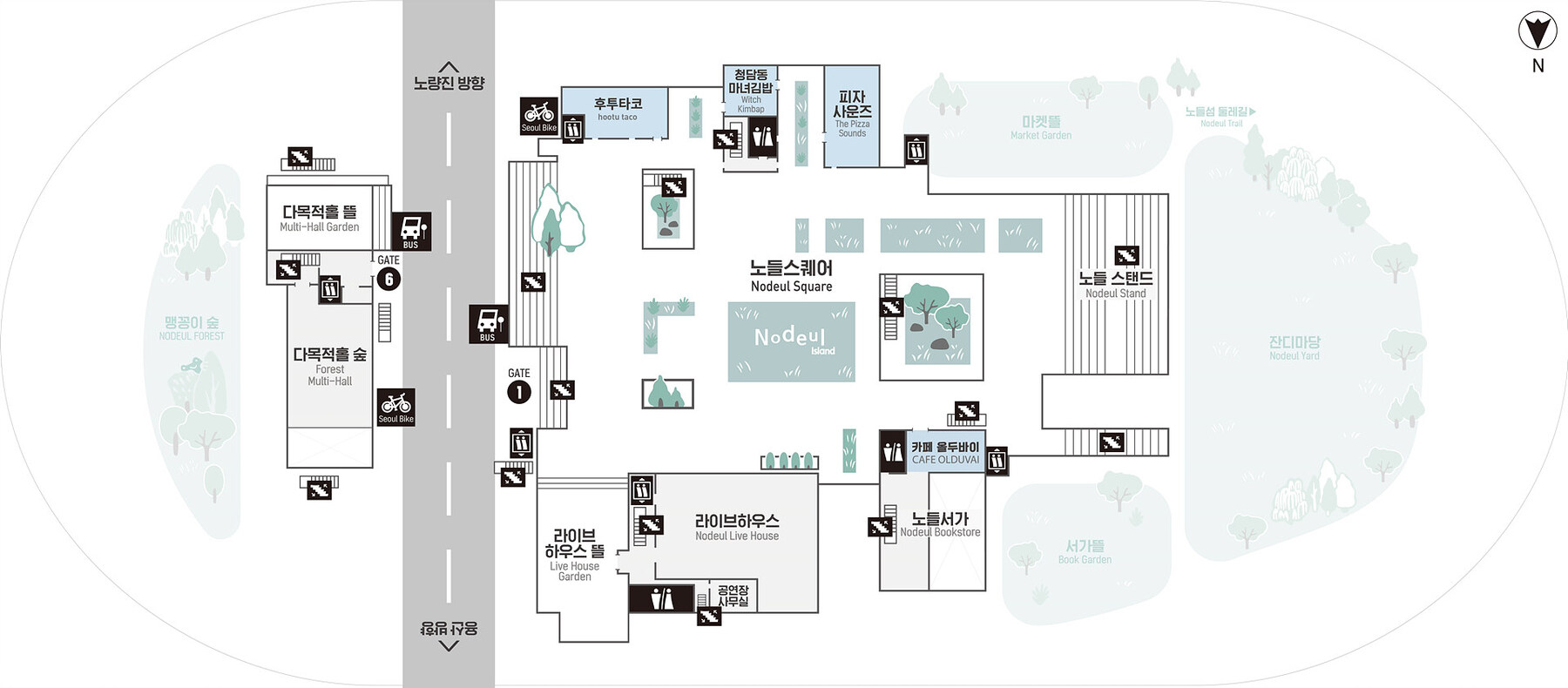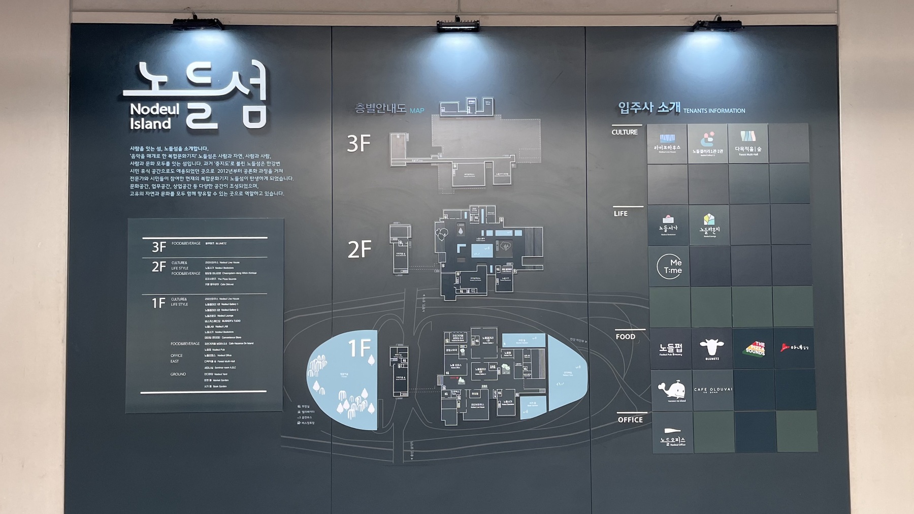 1층으로 들어가면 노들섬을 소개해주는 벽면이 가장 첫 번째로 보인다. 1층에는 노들 갤러리 1,2관, 노들 서가, 노들 라운지, 노들 펍, 노들 오피스, 라이브하우스가 있고, 2층에는 음식점들, 라이브하우스, 노들 서가가 있다.