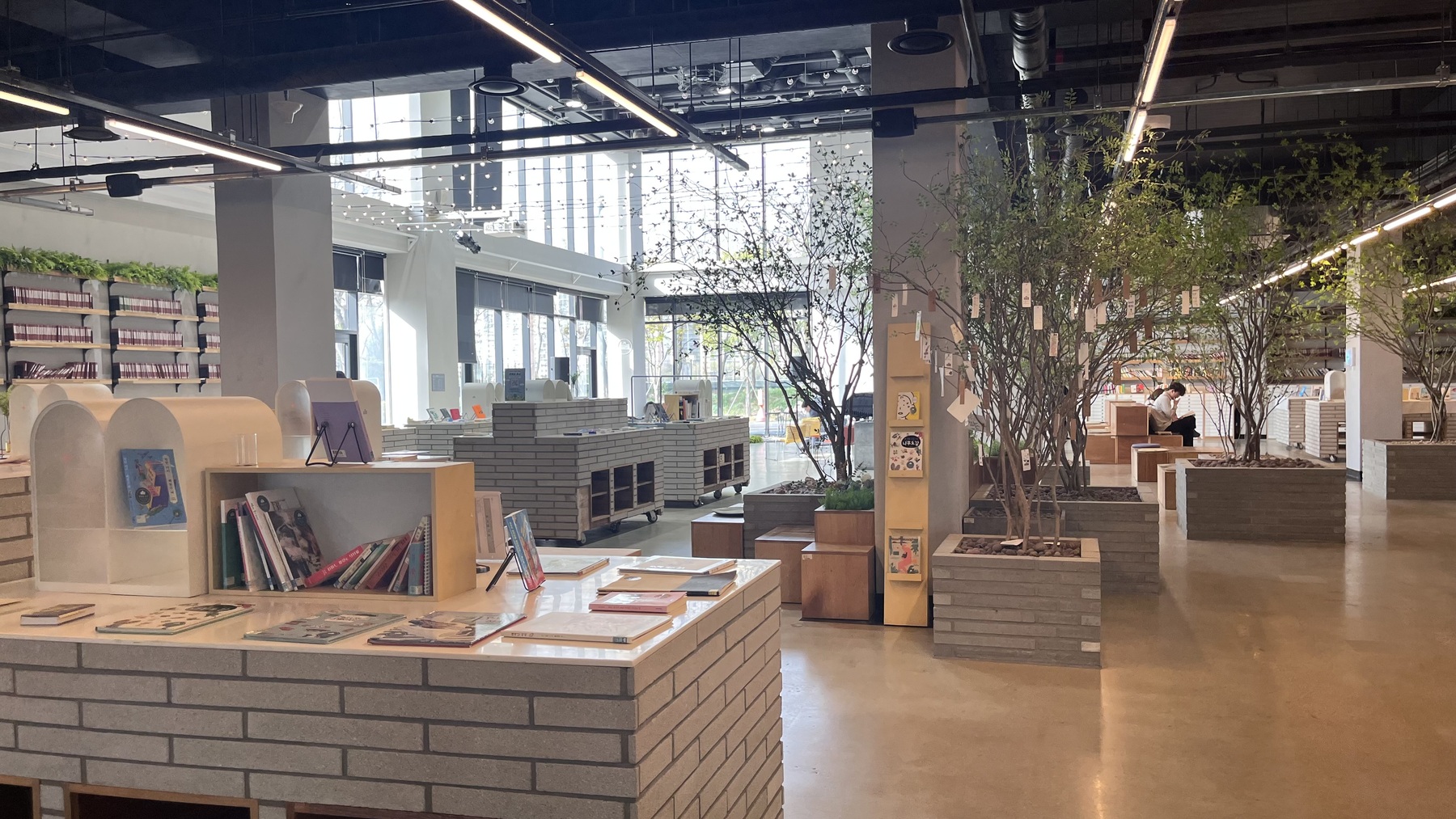 벽돌이 쌓여있는 듯한 책 전시대에 놓여 있는 책과 밖을 보게 놓인 의자, 벽 대부분을 채운 커다란 유리 커튼월은 공간을 따뜻하게 만든다.