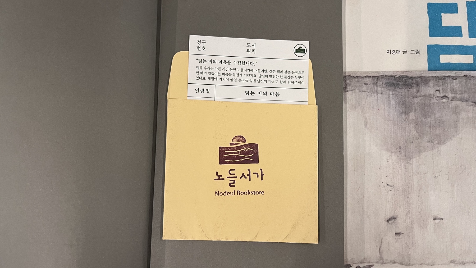 서가에 비치된 책에는 ‘읽는 이의 마음을 수집합니다’라는 봉투에 작은 종이가 하나 들어있다. 바로 이 책을 읽고 발견한 나만의 문장을 적을 수 있는 메모지이다. 위 종이에는 ‘비록 우리는 다른 시간 동안 노들 서가에 머물지만, 같은 책과 같은 문장으로, 한 때의 일렁이는 마음을 붙잡게 되겠지요. 당신의 한 문장은 무엇이었나요. 세월에 켜켜이 쌓일 문장들 속에 당신의 마음도 함께 담아주세요.’라는 말이 적혀 있다.