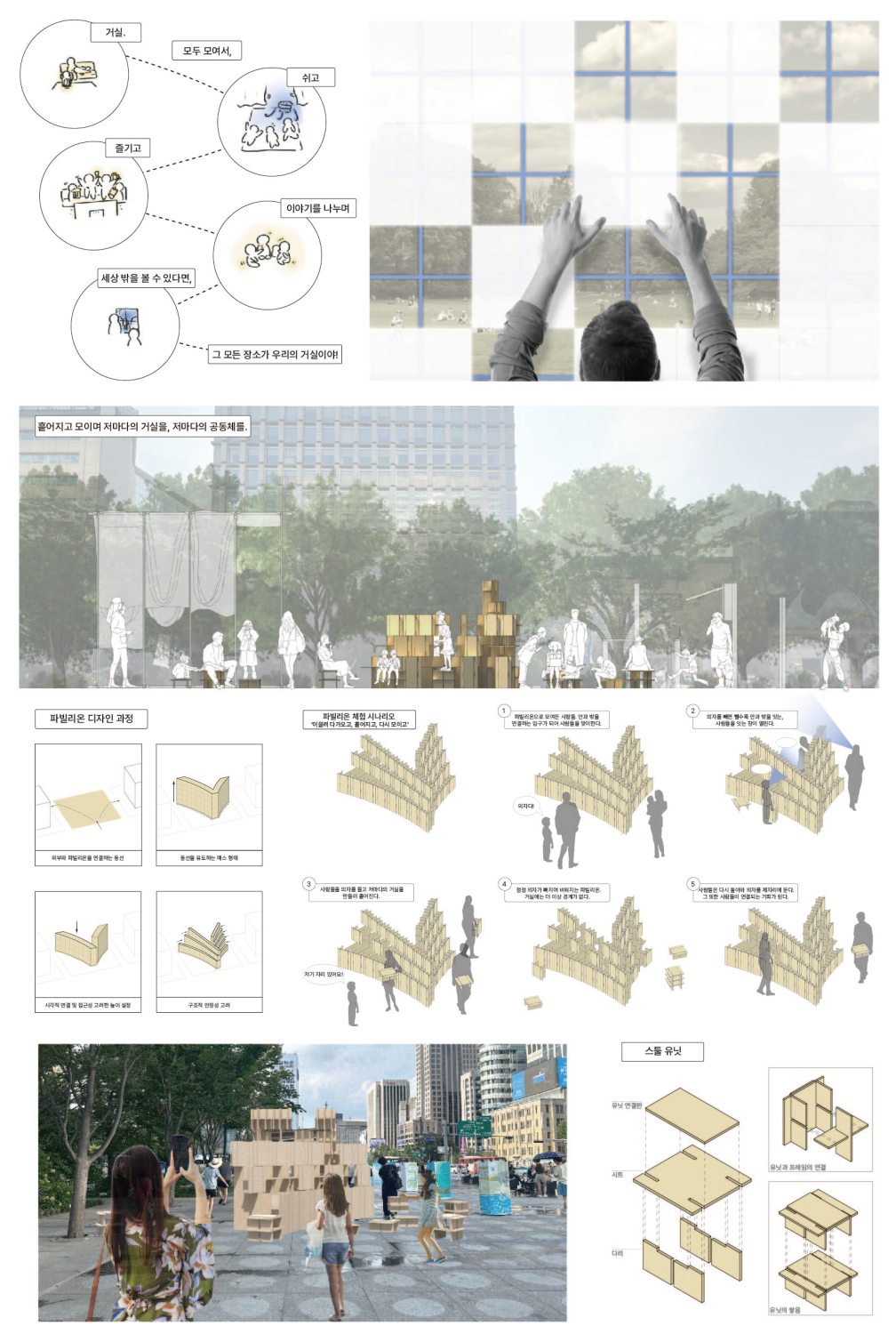‘한 아이를 키우려면 온 마을이 필요하다’는 말처럼, 공동체적 가치는 가족 단위에 국한해 생각할 것이 아니다. 골목 한복판에 평상을 깔아놓고 마을 사람들이 모여 시간을 보내는 모습은 과거 이웃간 정이 끈끈했던 우리나라 마을의 전형이다. 주거 공간 내에서 공동체적 생활을 기대하기 어려운 1인 주거 형태가 늘어나는 현재의 상황에서, 거실은 가족이라는 공동체를 대체하는 마을 주민들을 위한 공간으로 설명될 수 있다. 우리는 변화하는 공동체 인식과 함께, 거실이 전통적인 가족 단위의 연결성에서 나아가 도시 전체를 잇는 큰 의미의 공간이 되길 기대한다.