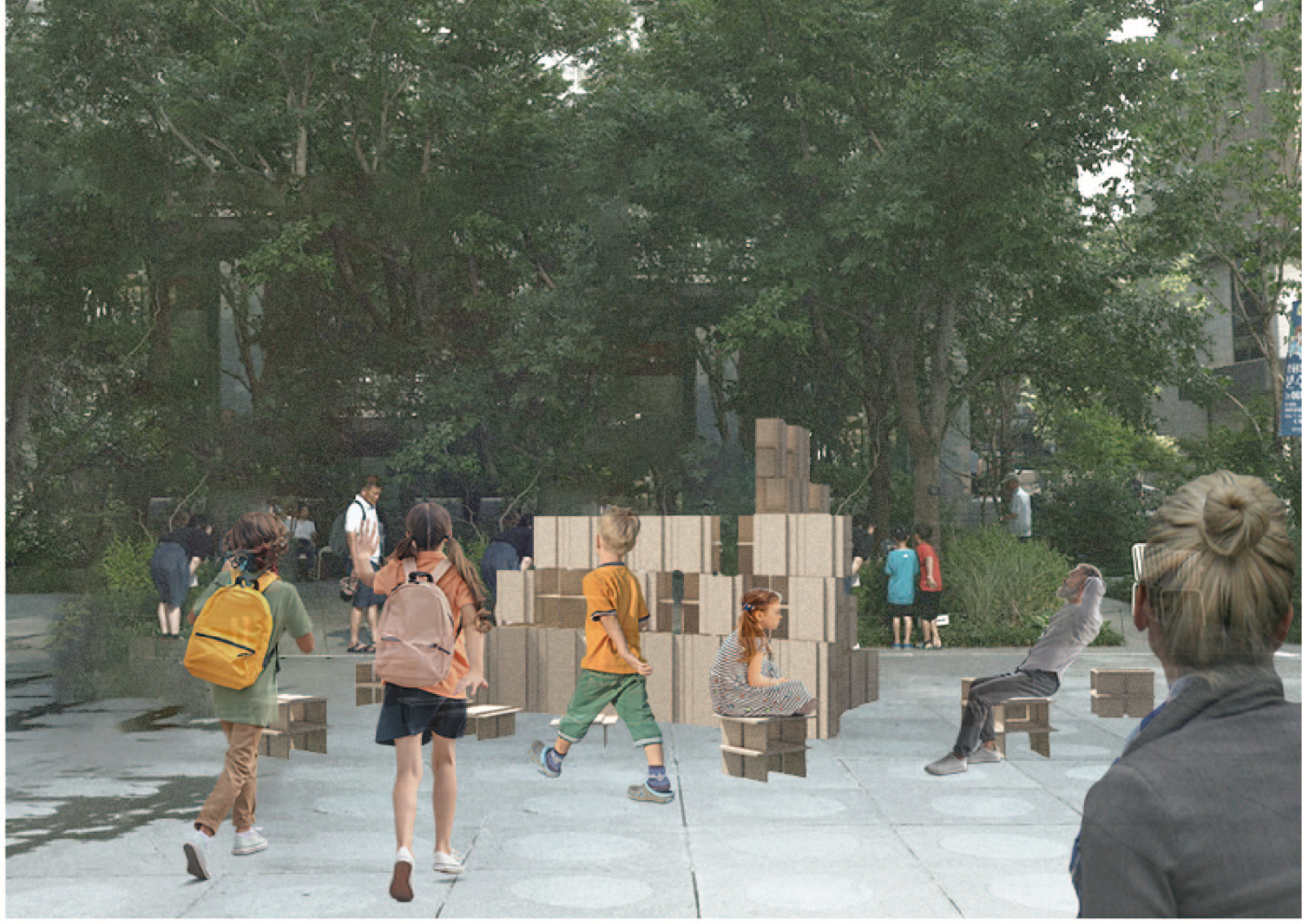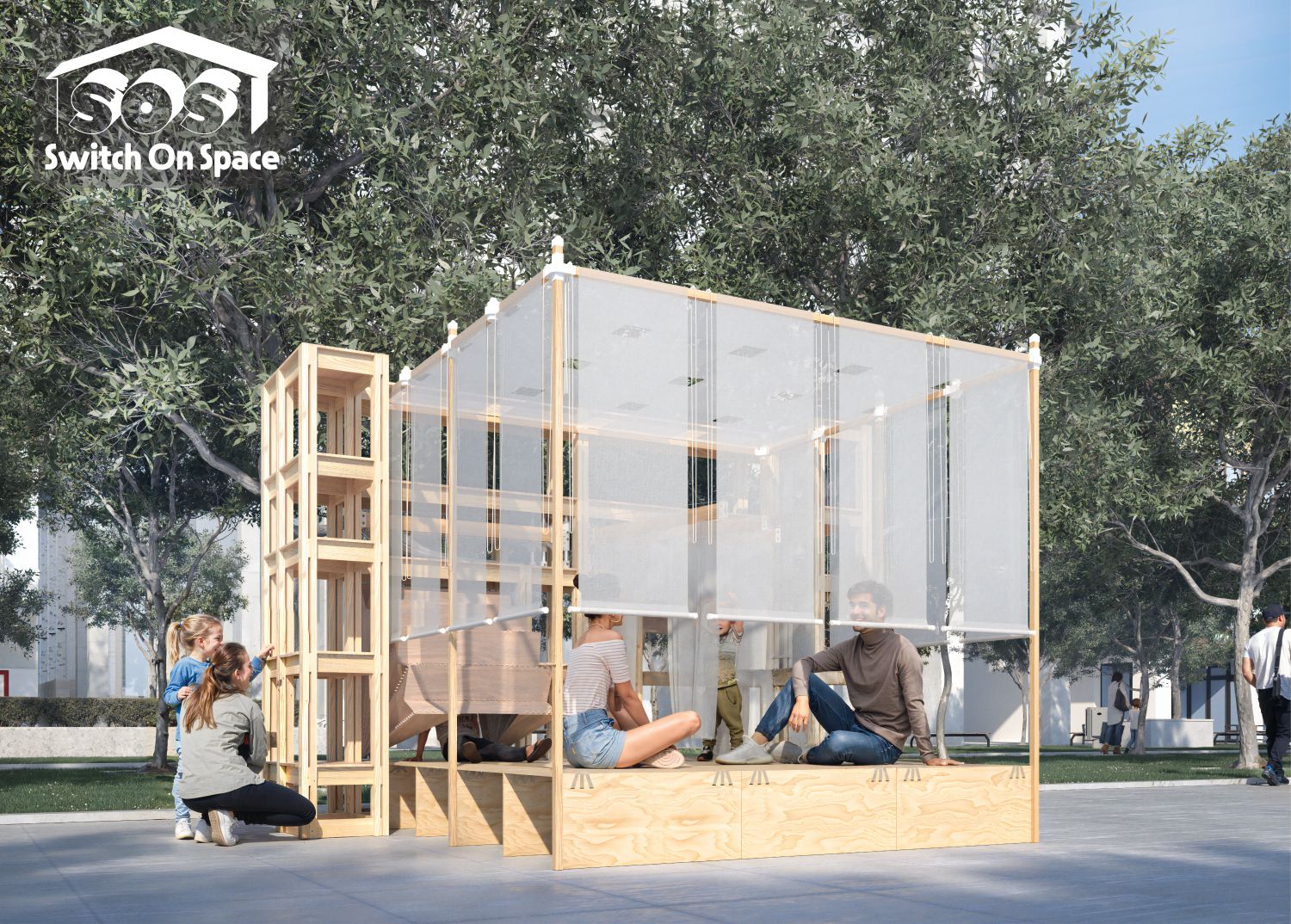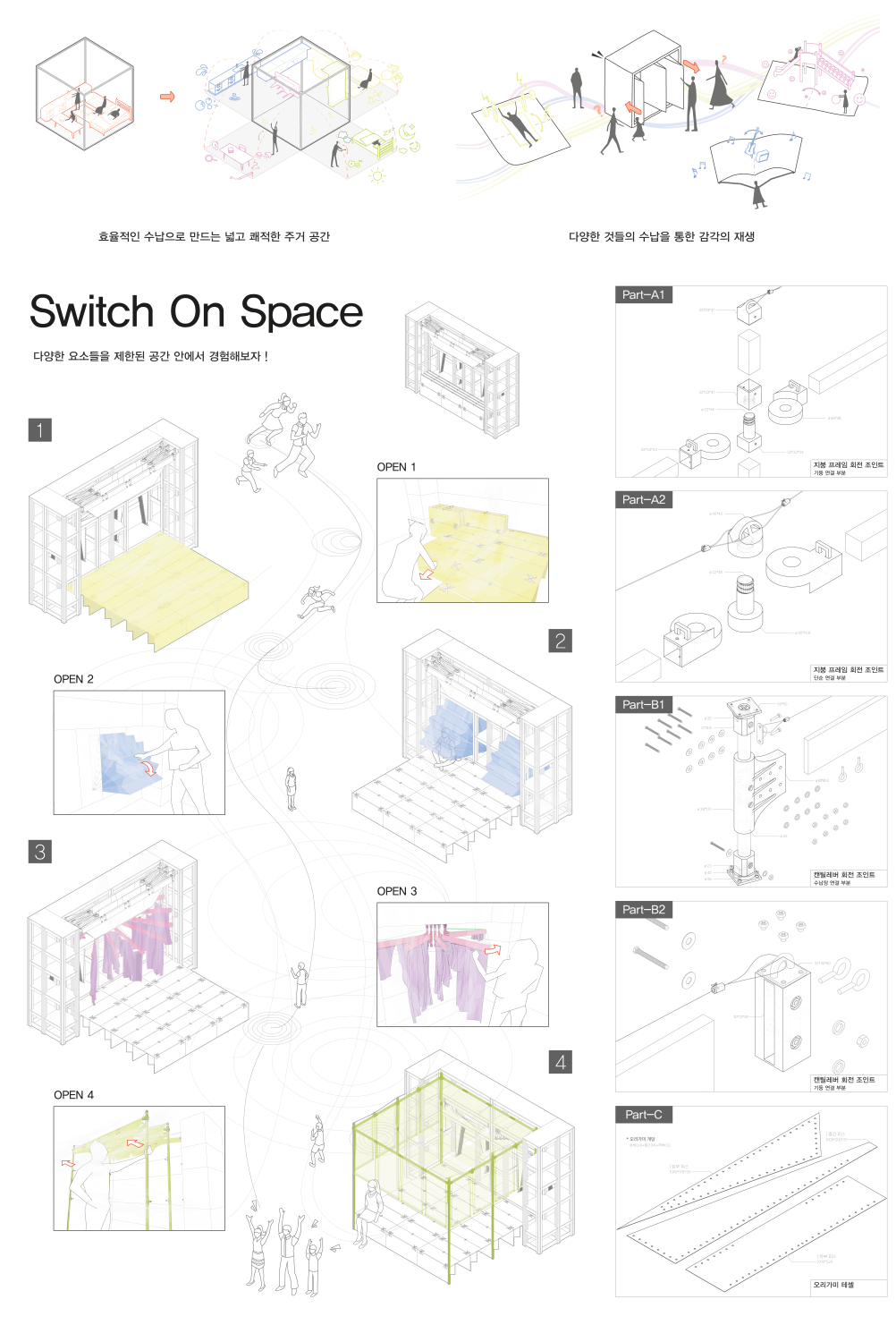 파빌리온에는 다양한 공간 요소가 수납되어 있습니다. 이 파빌리온을 전개하면 새로운 공간이 생성되며, 이는 가변적인 수납 공간의 특성을 드러냅니다. 시민들은 공간 요소를 꺼내고 수납하는 과정을 통해 다양한 공간을 경험할 수 있으며, 파빌리온을 통해서 새로운 형태의 수납과 주거 공간을 제안합니다.