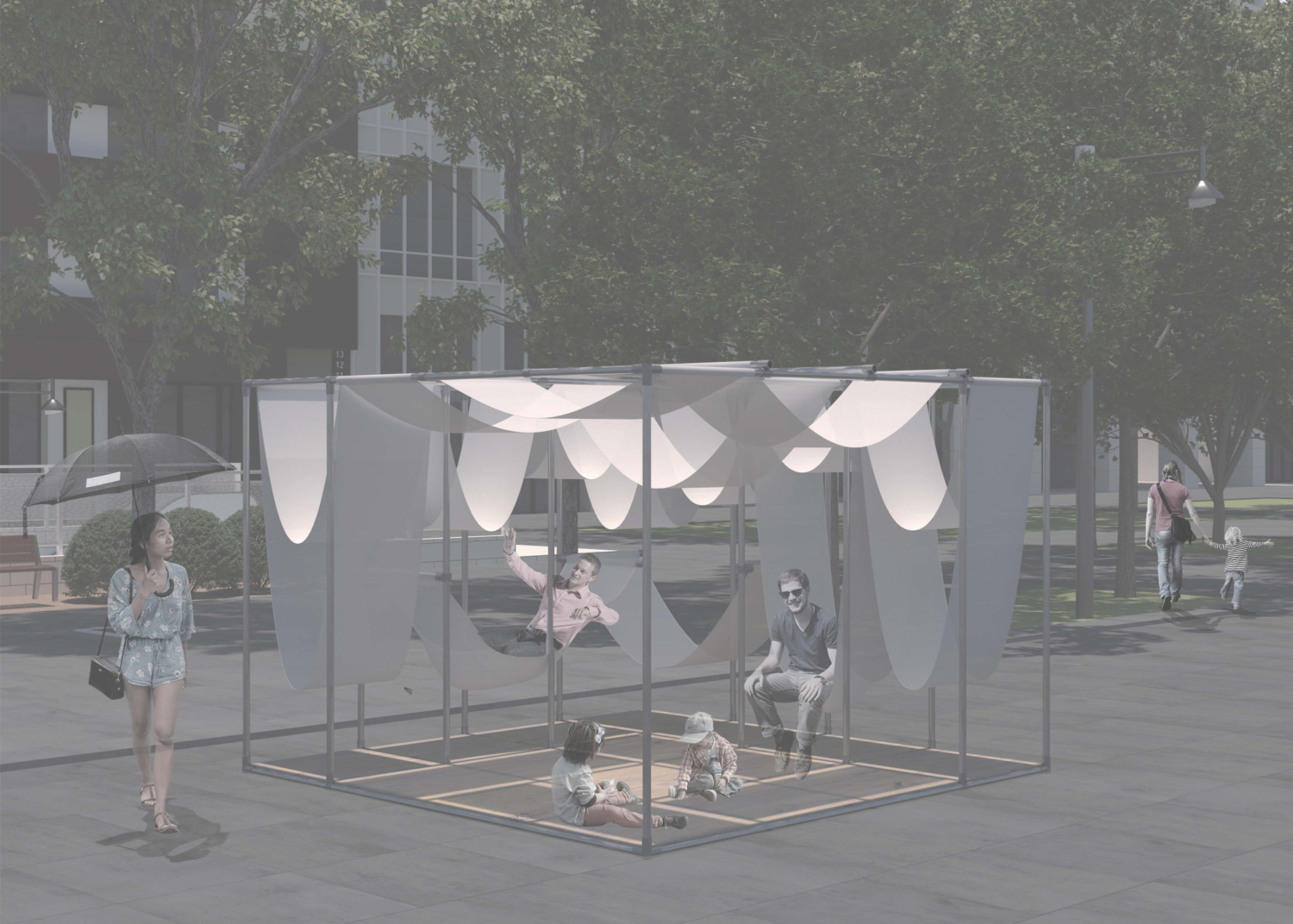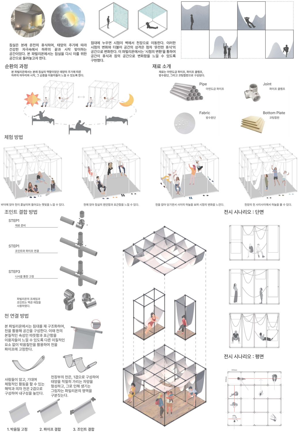 사람마다 사용하는 침실의 환경과, 침대의 높낮이, 크기가 다르듯이, 이 파빌리온도 사용 인원에 따라 다양하게 사용할 수 있도록 설계되었다. 각 해먹, 의자 유닛들에서는 이용자들이 각기 다른 휴식의 형태를 체험할 수 있으며, 사용자마다 유동적으로 선택, 조절하여 사용할 수 있게 하였다.