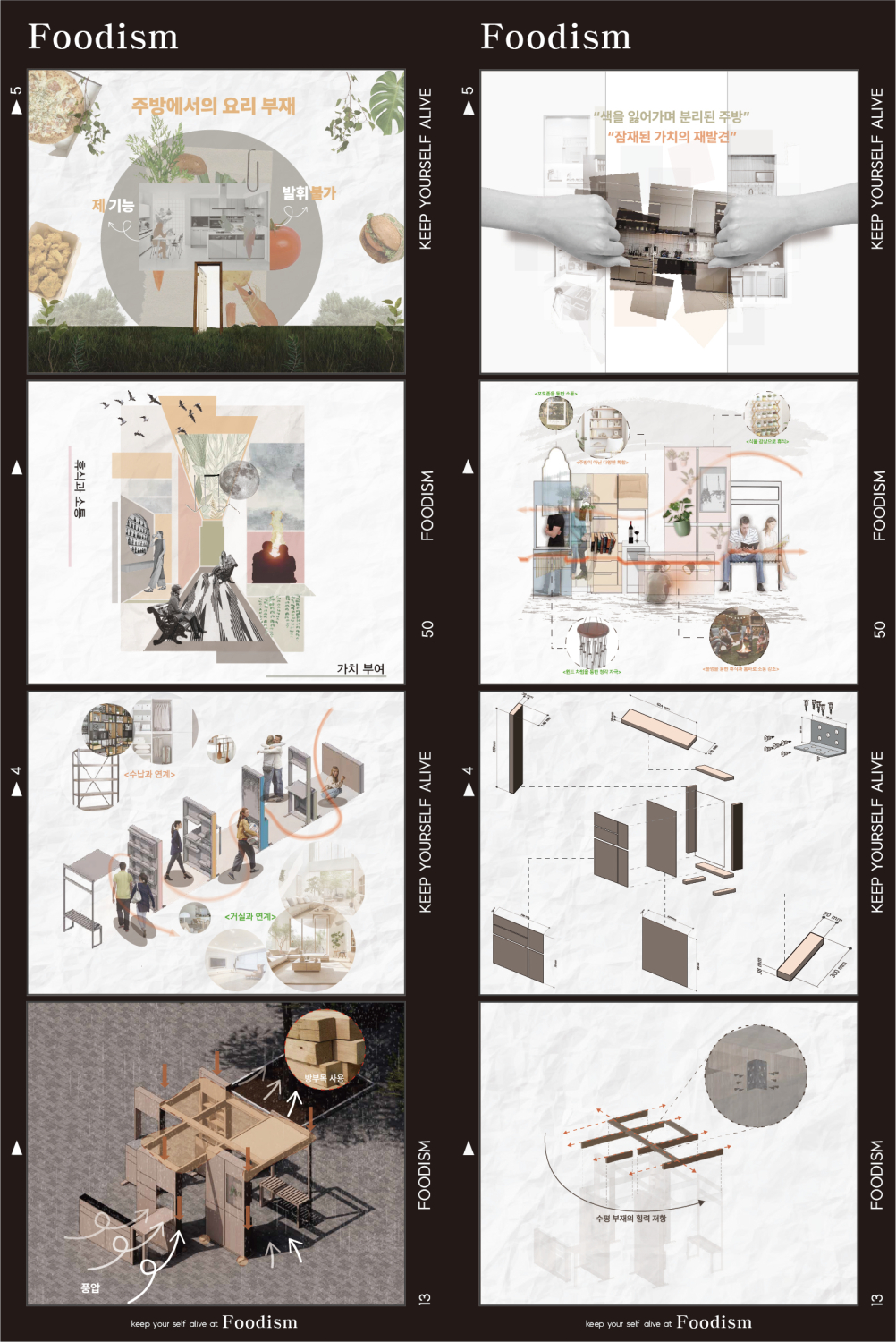 현대의 주방은 여러 과정을 거쳐 요리를 하고 밥을 먹는 공간으로 존재했다. 하지만 요즘 생활상의 변화와 기술의 발전으로 배달, 간편음식 등의 소비 증가로 인한 기존 주방들의 기능들의 사용률이 떨어지고 있다. 이 때문에 주방에서 요리라는 과정이 없어짐으로 주방의 색이 빛바래 가고 있고 모든 활동이 없어지고 있기 때문에 공간의 의미와 존재로서 닫혀 가고 있다.