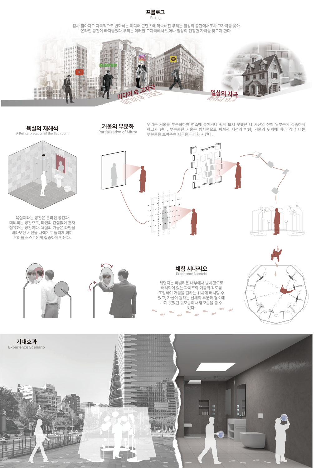 체험자는 파빌리온 내에서 거울을 통해 자신의 다양한 모습을 마주하며 타인을 향하던 시선을 자신에게로 돌리게 됩니다. 이러한 경험과 자극은 단순한 전시의 개념을 넘어 실제 일상으로 이어지며 일상에서 진정한 자신의 모습을 마주하고, 이를 통해 체험자는 건강한 자극을 되찾아 새로운 시각으로 일상을 바라볼 수 있게 됩니다.