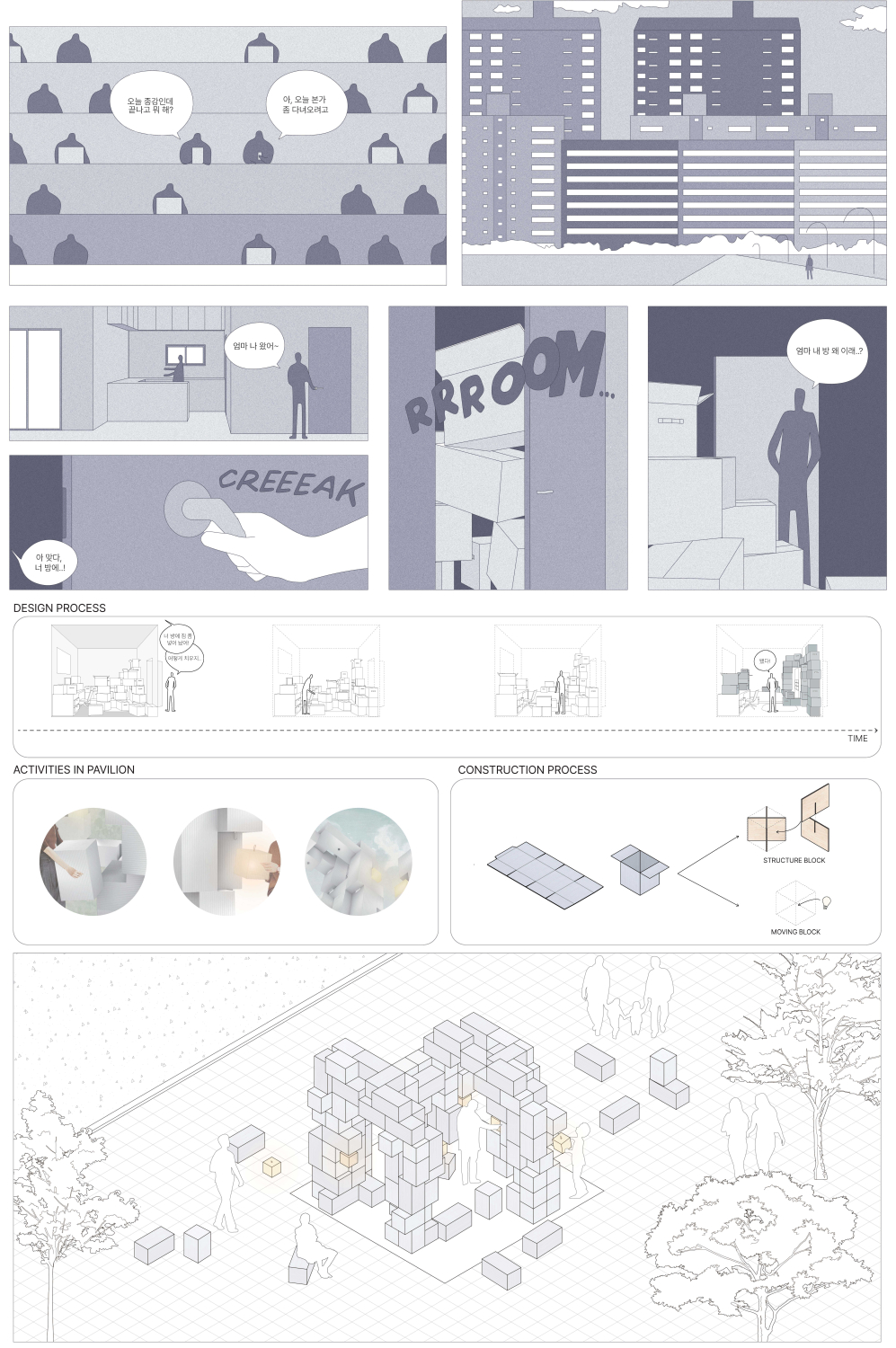 따라서 우리는 주거 속 가장 친숙한 ‘내 방’을 기준으로 가구들을 피해 여러 형태의 짐들이 쌓여가는 모습을 파빌리온으로써 표현하고자 했다. 파빌리온은 박스의 기본 형태인 정육면체와 직육면체의 박스 블럭들로 구성된다. 각각의 박스들은 실제 이삿짐 박스에 사용되는 플라베니아 재질(이삿짐 박스)을 사용하여 시민들에게도 창고로 인식될 수 있게 하였다. 파빌리온 안에는 구조체로서 작용하는 고정 블럭들이 있고 시민들이 자유롭게 이동 가능한 유동블럭이 있어 시시각각으로 시민들과 상호작용이 가능하다.