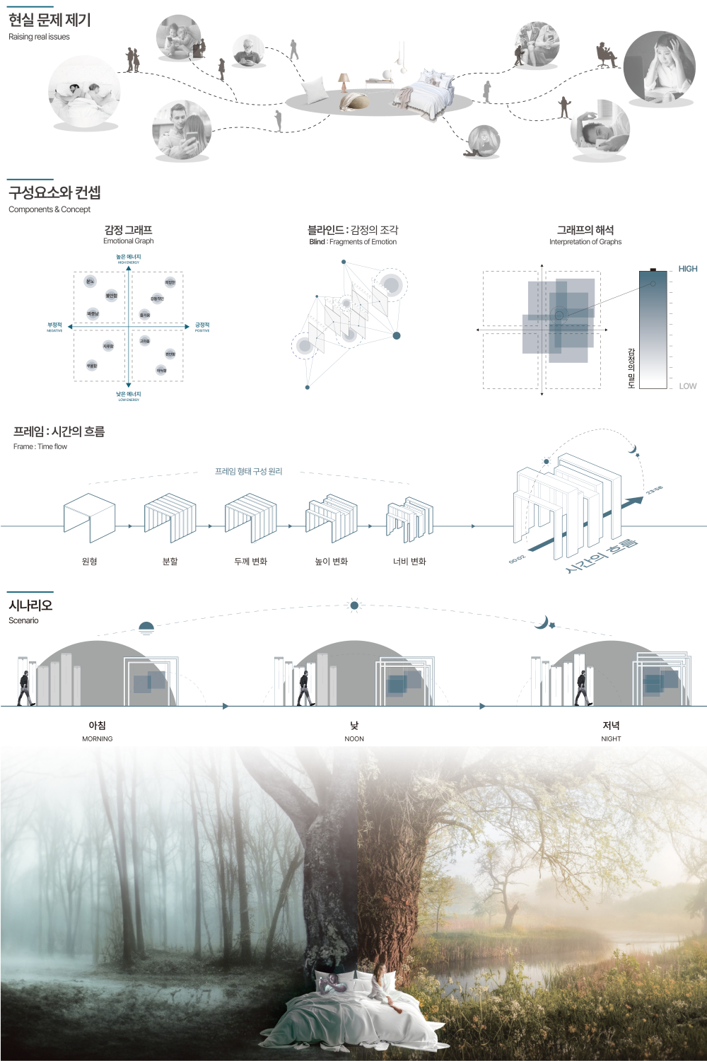 이 시퀀스를 경험한 누군가는 자신의 하루 감정 그래프를 공유하고 간직하면서 하루의 감정변화와 흐름에 대한 흥미를 갖는다. 나아가 하루를 되돌아본다는 것이 침실에서 잊혀져가는 행위를 상기시키고 자아성찰을 통해 자신을 돌보고 성장할 수 있는 기회를 제공할 수 있다. 최종적인 목표는 침실에서 온전히 자신을 바라보는 현실집중의 중요성을 깨닫고 잊혀진 본래의 기능을 되찾을 수 있도록 하는 것이며, 마지막으로 ‘하루조각’에서의 경험 또한 하나의 감정 조각을 만들고 이러한 기억이 주거 공간에서의 즐거움과 소중함을 깨닫는 계기가 되기를 바란다.