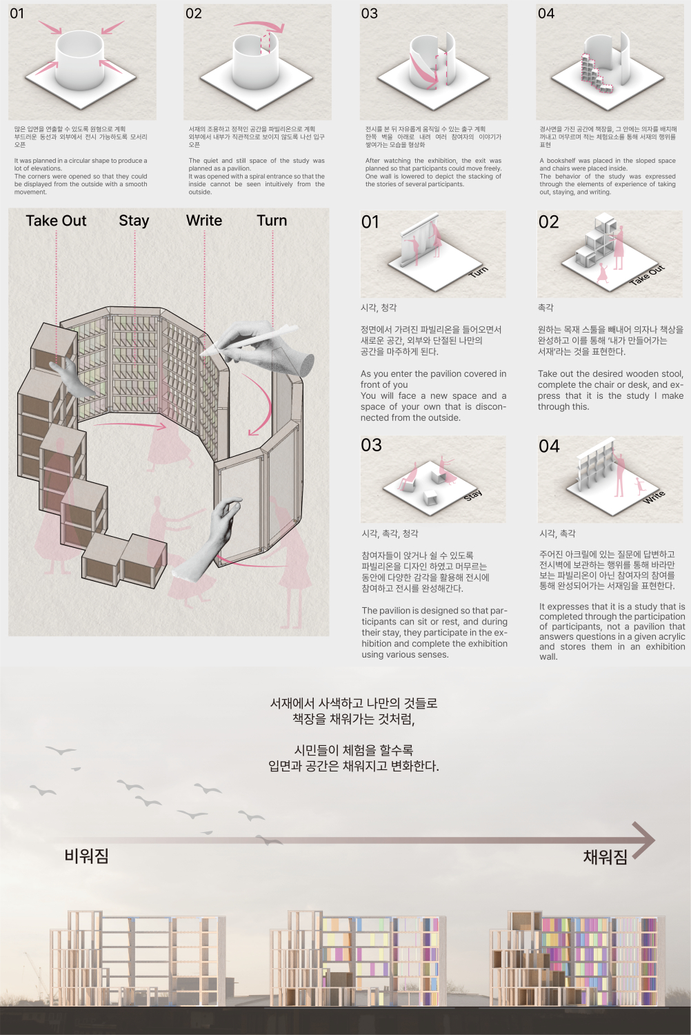 우리의 서재라는 개인적인 공간을동적 공간으로 재해석해 감각적 체험을 통해 느리고 건강한 현실의 자극을 경험하길 원한다.
