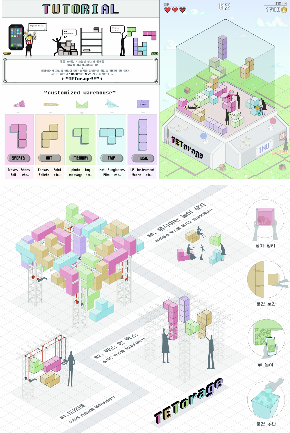 상부 블록에 물건을 저장하고, 선택적으로 블록을 움직이면서 사용자(플레이어)의 개성과 감성이 담긴 특별한 창고 공간으로 변화한다. 다양한 물건을 저장하는 역할과 더불어, 추억을 기록하고 만들 수 있는 [TETorage] 파빌리온을 통해 잊고 있던 건강한 기억을 되찾을 수 있길 바란다.