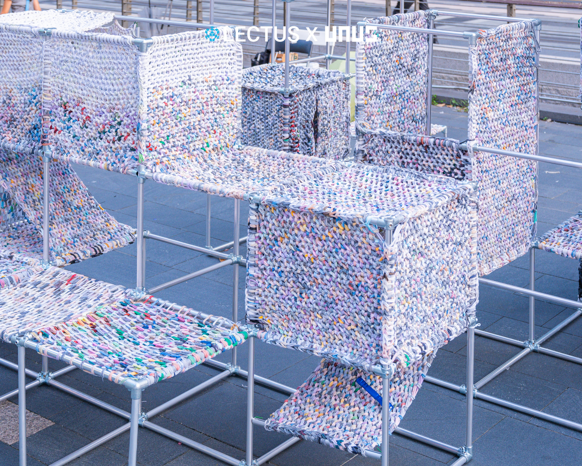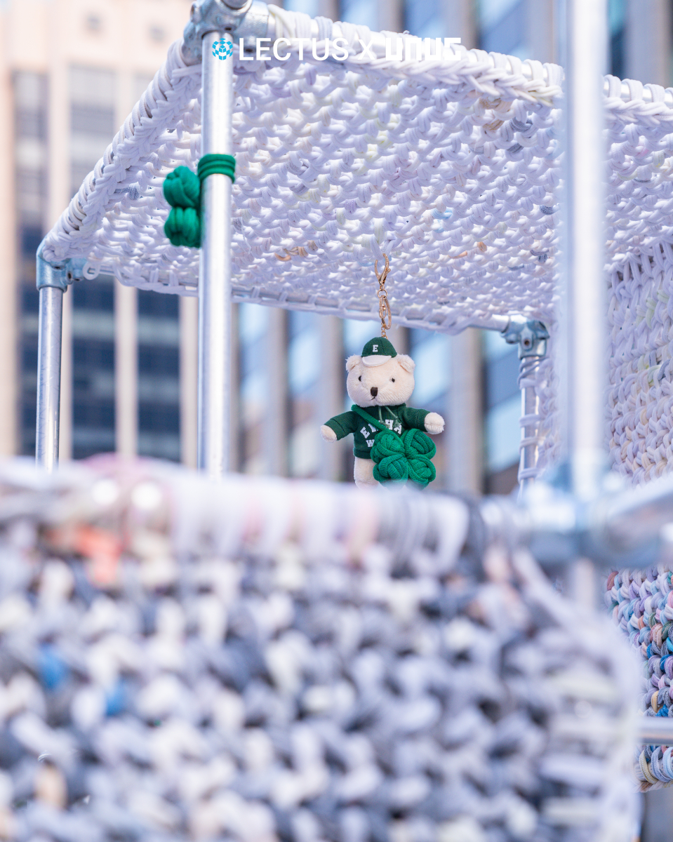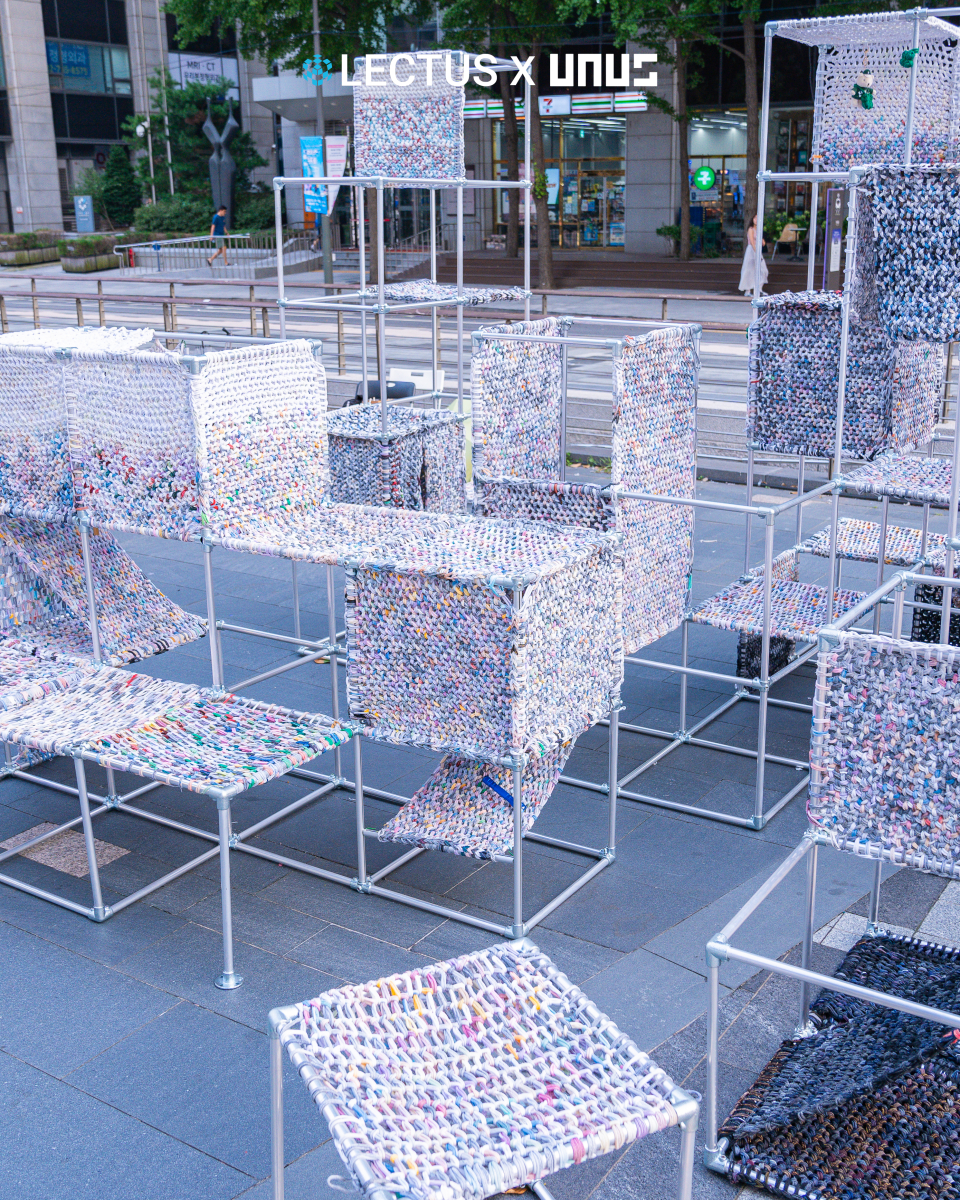 찾는 행위를 하는 동안 만나는 파빌리온의 재료는 주거 속 수납공간에서 쉽게 만날 수 있는 옷-면재를 형상화하여 폐직물인 양말목을 재사용하였고, 또한 형태에서 주거공간 속 다양한 수납공간의 높이를 재현하였습니다.