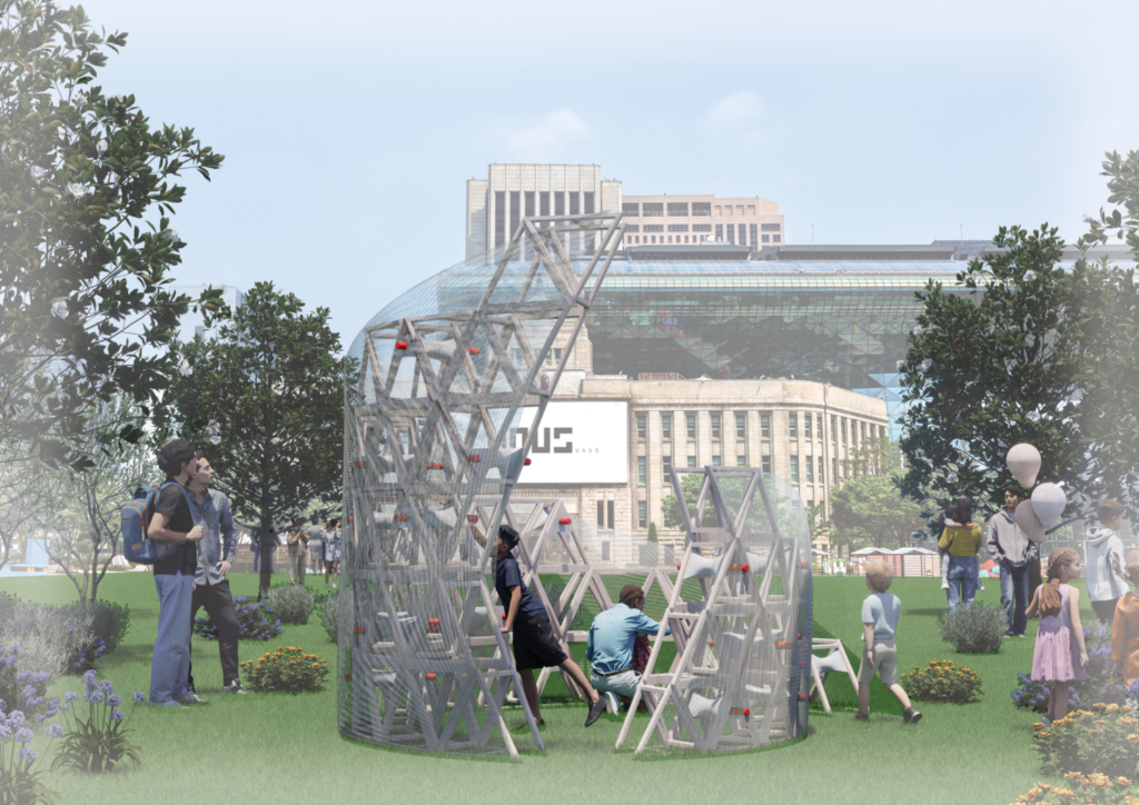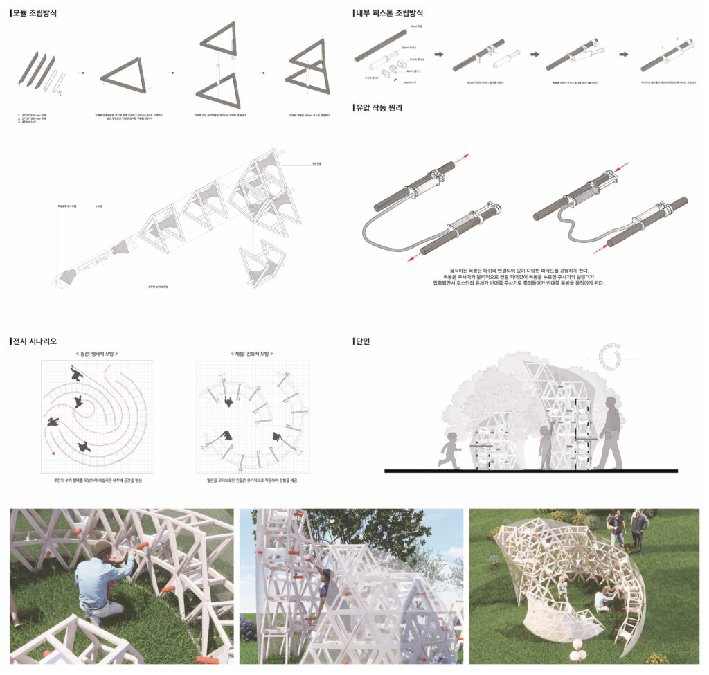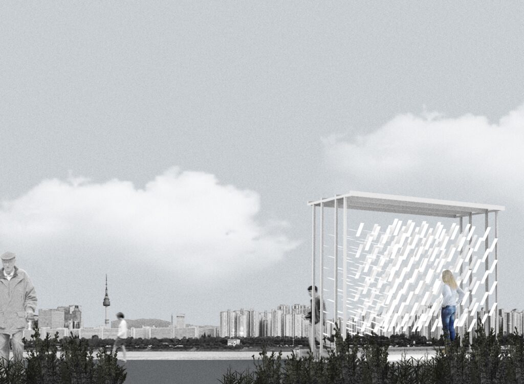 이 원리를 바탕으로 파빌리온 외피는 ‘핀’ 구조를 통해 열이 빠져나가는 대류 현상을 시각화한다. 체험자가 핀을 밀고 당기면 움직임이 구조에 흔적으로 남아 형태가 변화하고, 사람이 많이 모일수록 더 많은 핀이 작동해 외피의 밀도와 모양이 달라진다. 도시에 쌓이는 열처럼, 축적된 접촉이 공간을 바꾼다.