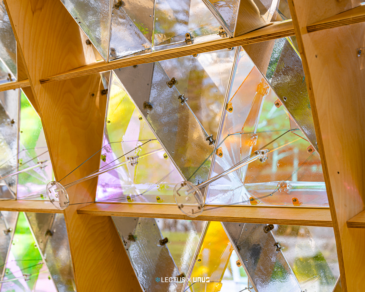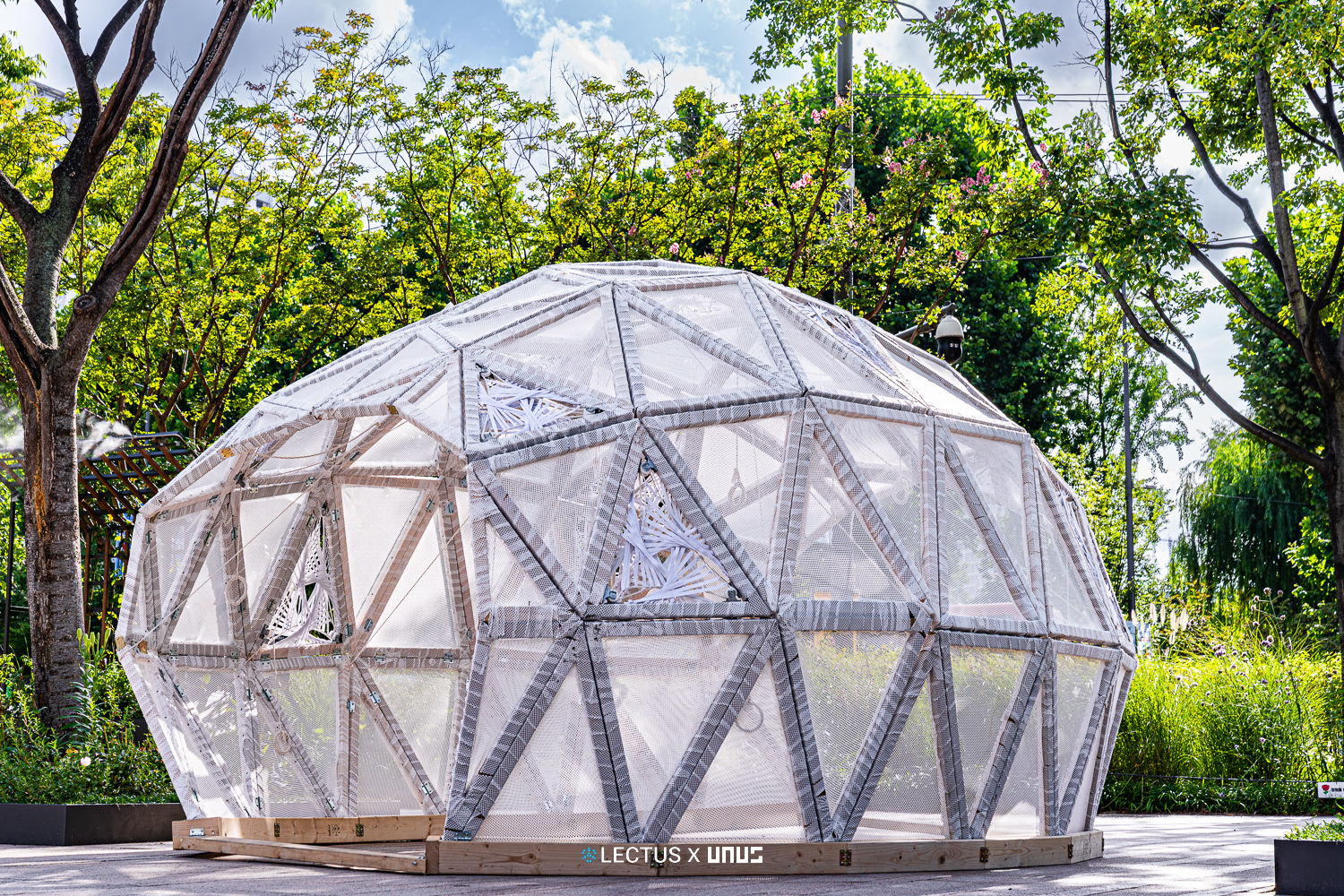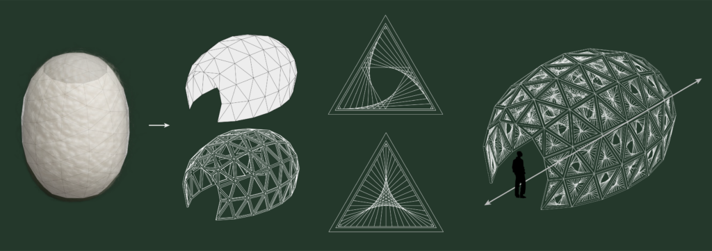 지오데식 돔 구조를 기반으로 다수의 삼각형 모듈이 연결된 형태로 구성되며, 각 모듈은 카메라 조리개와 유사한 규조의 실 패턴 시스템으로 작동한다. 이 삼각형 모듈은 손잡이를 당기는 방식으로 작동시킬 수 있으며 내부 사용자에게 그늘과 빛을 조절하는 공간적 체험을 제공한다.  사용자는 장치와의 상호작용을 통해 구조적 변화와 빛의 유입 차단을 경험하며, 마치 누에고치의 기공이 외부환경에 반응하듯 건축이 환경 자극에 따라 능동적으로 응답하는 과정을 상징적으로 재현한다.