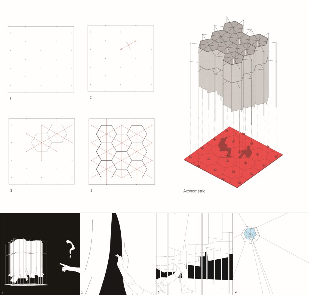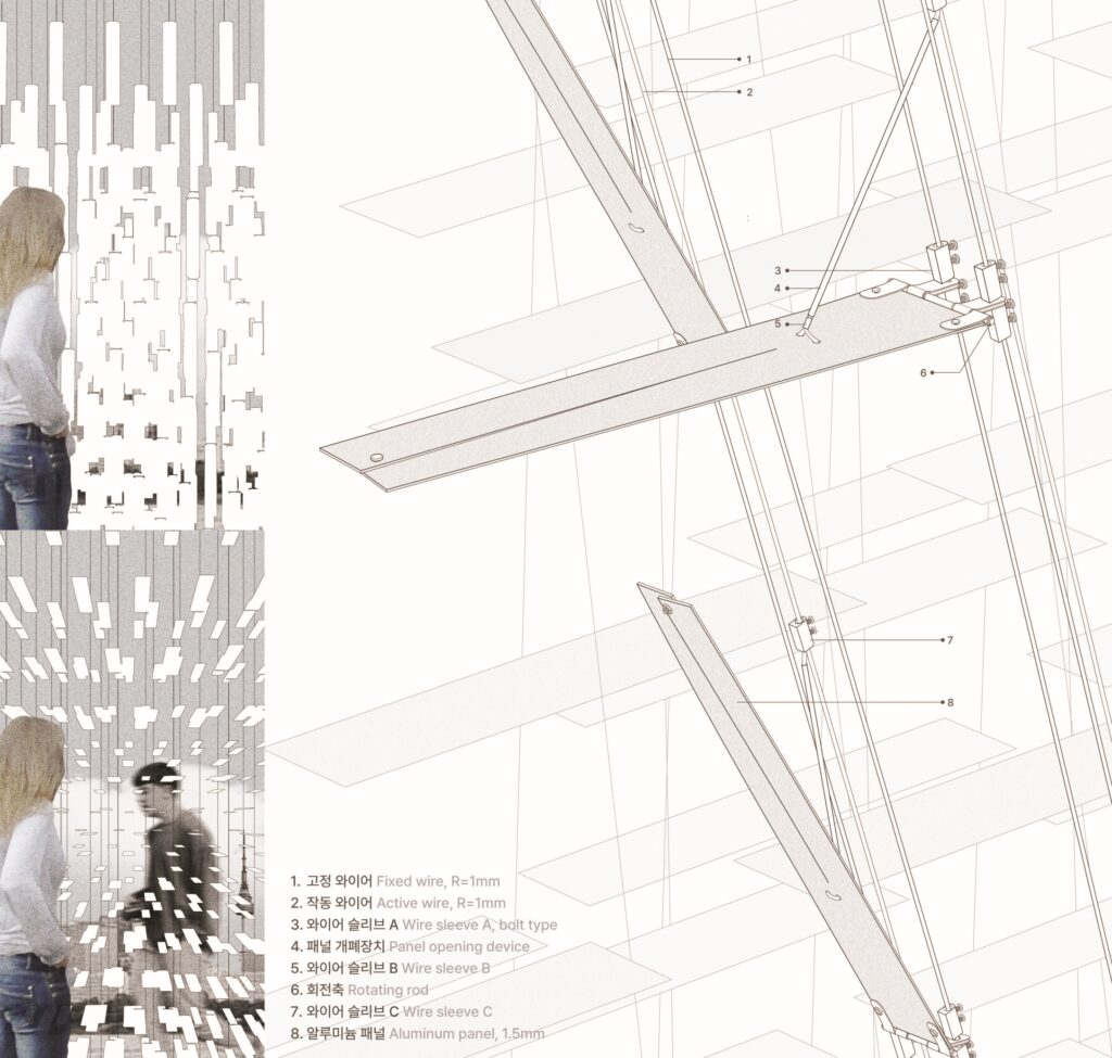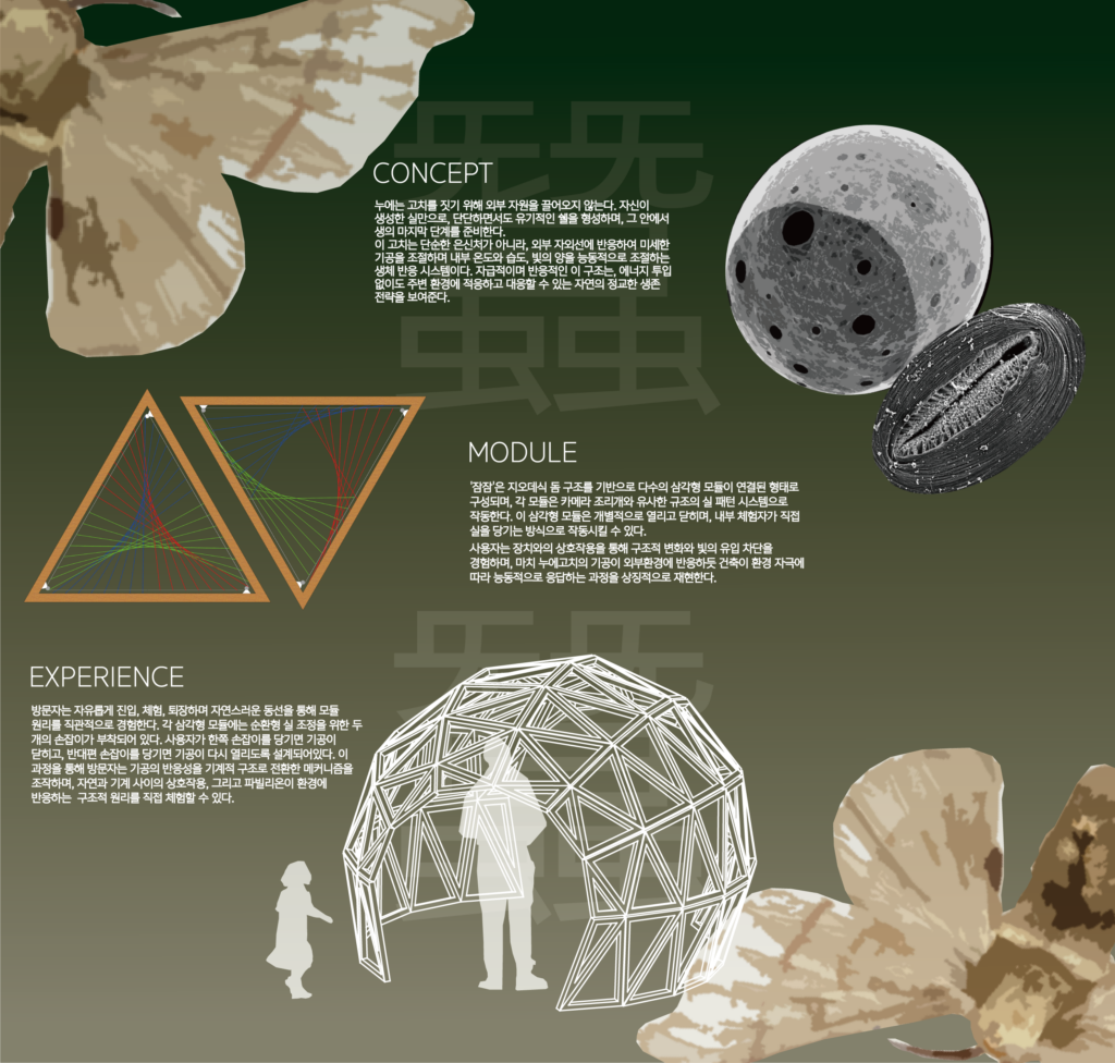 누에고치는 외부 자외선에 반응하여 고치의 미세 기공을 조절하는 외부 환경 변화에 따라 유연하게 대응하는 자연의 정교한 시스템을 갖추고 있다. ‘잠잠(蠶蠶)’은 이러한 원리를 건축적 장치로 재해석하여 기공의 조밀도 차이를 조리개 구조로 치환하고, 사용자의 조작이나 외부 조건에 따라 공간이 유기적으로 반응하는 건축적 메커니즘을 구현한다.