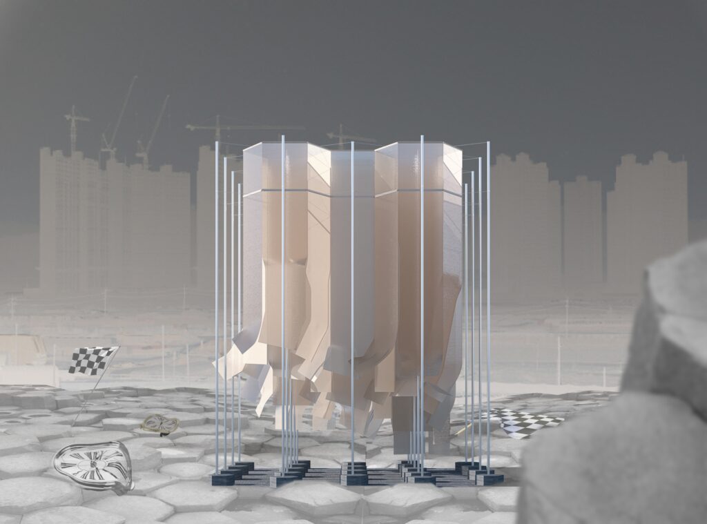 본 파빌리온은 피부에 존재하는 미세한 근육인 ‘기모근’의 생체 반응 원리를 바탕으로 설계되었다. 기모근은 교감신경의 지배를 받아 외부 온도 변화나 정서적 자극에 반응하며 수축한다. 이로 인해 털이 피부 위로 세워지는 현상이 나타난다. 이는 단순한 물리적 반응이 아닌, 환경과 교감하는 감각적 메커니즘이다. 본 파빌리온은 이러한 원리를 건축적으로 해석하여 사람의 움직임을 자극으로 감지하고 패널이 반응하며 공간이 재구성된다. 이는 건축이 더 이상 고정된 형태가 아닌 다양한 관계 속에서 끊임없이 새롭게 정의되는 유기적 상태임을 드러낸다.