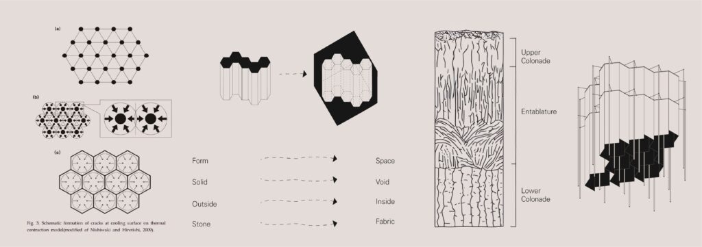 주상절리는 용암이 급격히 식어 형성된 육각기둥 형태의 지형이다. 육각 형태는 용암의 수축 과정에서 응력을 가장 효율적으로 분산시키기 위해 선택된 결과이다. 단단한 육각형의 주상절리는 꿈틀거리던 과정의 모습을 숨긴 채, 결과로서 존재한다. 육각기둥만이 수축의 과정을 암시할 뿐이다.