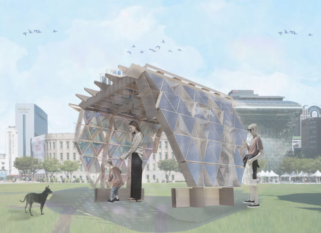 외피에는 다이크로익 필름과 미러 필름을 적용해, 빛의 각도나 시간에 따라 다른 시각 효과를 연출하며 위장과 노출, 반사를 반복한다. 이는 환경과 감각의 흐름을 공간적으로 시각화한 장치다. Auxetic 거동 원리를 기반으로 삼각형 접이식 모듈을 사용하여 팽창과 수축을 반복한다.