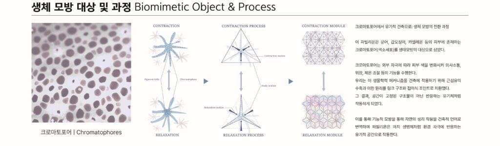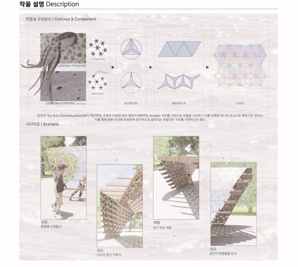 ‘CpR’은 문어, 갑오징어 등 해양 생물의 피부에 존재하는 색소세포 ‘크로마토포어(Chromatophore)’에서 착안하여, 반응하는 건축의 새로운 가능성을 제안한다. 크로마토포어는 자극에 따라 색을 수축·이완하며 외부 환경과 소통하는데,우리는 이 생물학적 메커니즘을 구조적 언어로 번역하였다. 근섬유의 반복적 움직임은 링크 구조와 접이식 모듈로 구현되었고, 각 모듈은 사용자의 동작에 반응하며 유기적으로 펼쳐지고 접힌다.