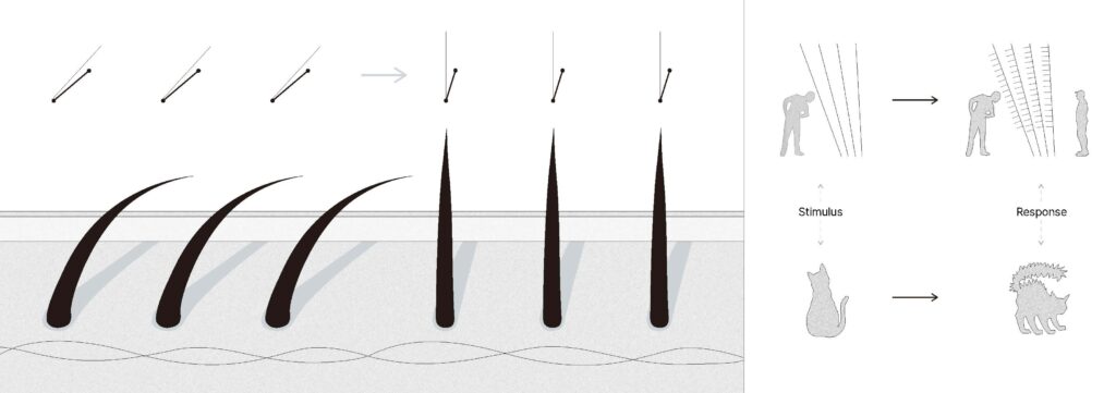 본 파빌리온은 피부에 존재하는 미세한 근육인 ‘기모근’의 생체 반응 원리를 바탕으로 설계되었다. 기모근은 교감신경의 지배를 받아 외부 온도 변화나 정서적 자극에 반응하며 수축한다. 이로 인해 털이 피부 위로 세워지는 현상이 나타난다. 이는 단순한 물리적 반응이 아닌, 환경과 교감하는 감각적 메커니즘이다. 본 파빌리온은 이러한 원리를 건축적으로 해석하여 사람의 움직임을 자극으로 감지하고 패널이 반응하며 공간이 재구성된다. 이는 건축이 더 이상 고정된 형태가 아닌 다양한 관계 속에서 끊임없이 새롭게 정의되는 유기적 상태임을 드러낸다.