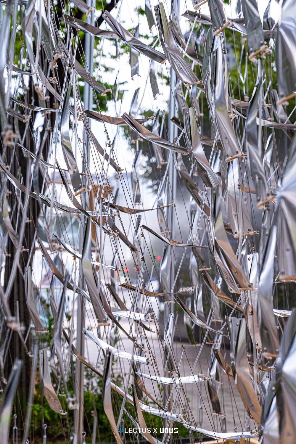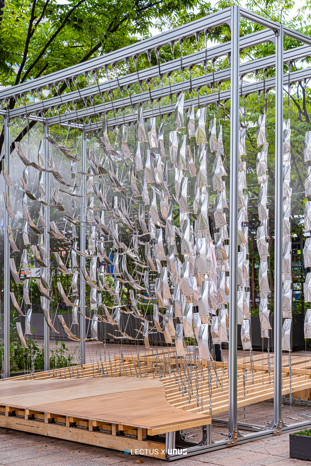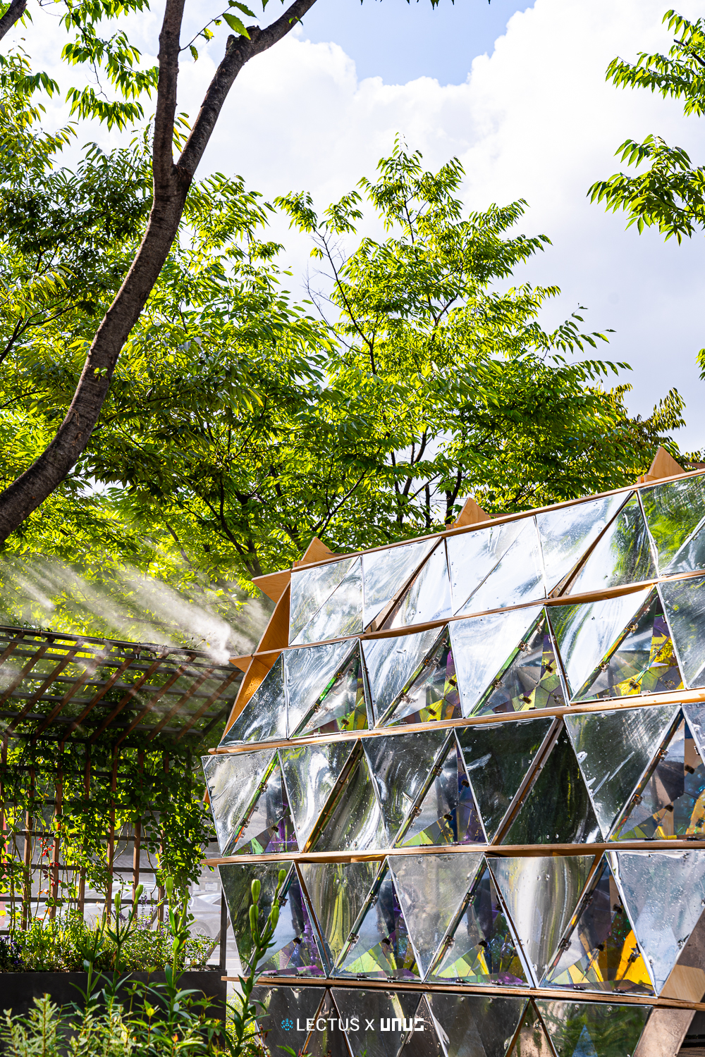 외피에는 다이크로익 필름과 미러 필름을 적용해, 빛의 각도나 시간에 따라 다른 시각 효과를 연출하며 위장과 노출, 반사를 반복한다. 이는 환경과 감각의 흐름을 공간적으로 시각화한 장치다. Auxetic 거동 원리를 기반으로 삼각형 접이식 모듈을 사용하여 팽창과 수축을 반복한다.