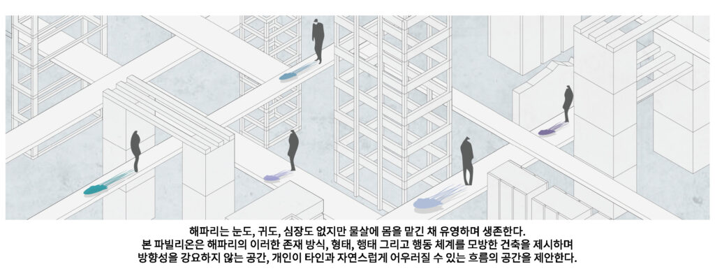 딱딱하게 쳇바퀴처럼 돌아가는 삶을 살아가는 현대 사회 속 사람들에게 아무 생각 없는 해파리처럼 목표 없이 유영할 수 있는 공간을 만들고자 한다. 꼭 어디를 향하지 않아도 그것만으로도 충분히 잘 살고 있음을, 가끔은 해파리처럼 생각을 내려놓을 수 있도록 하는 공간을 구성하였다.