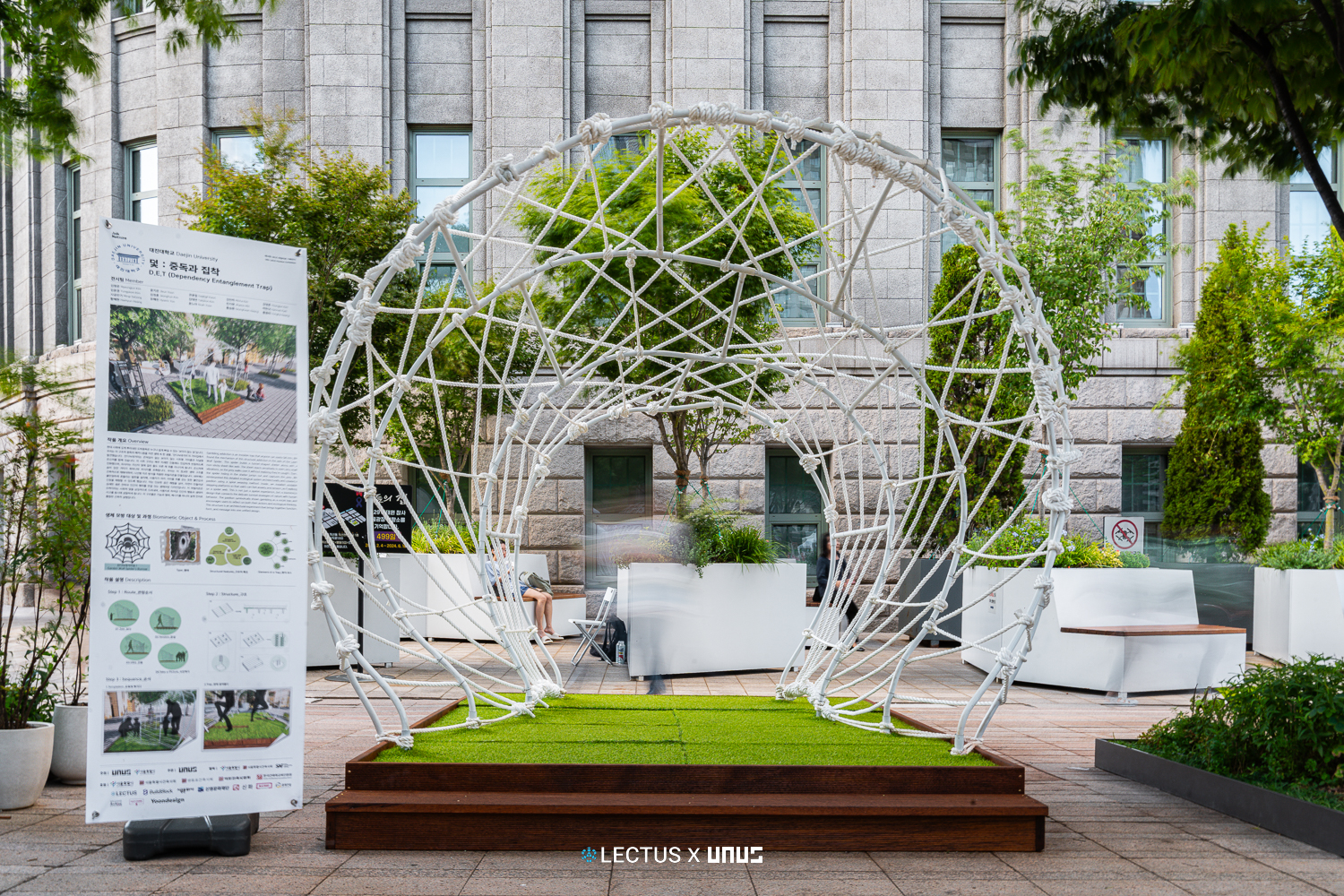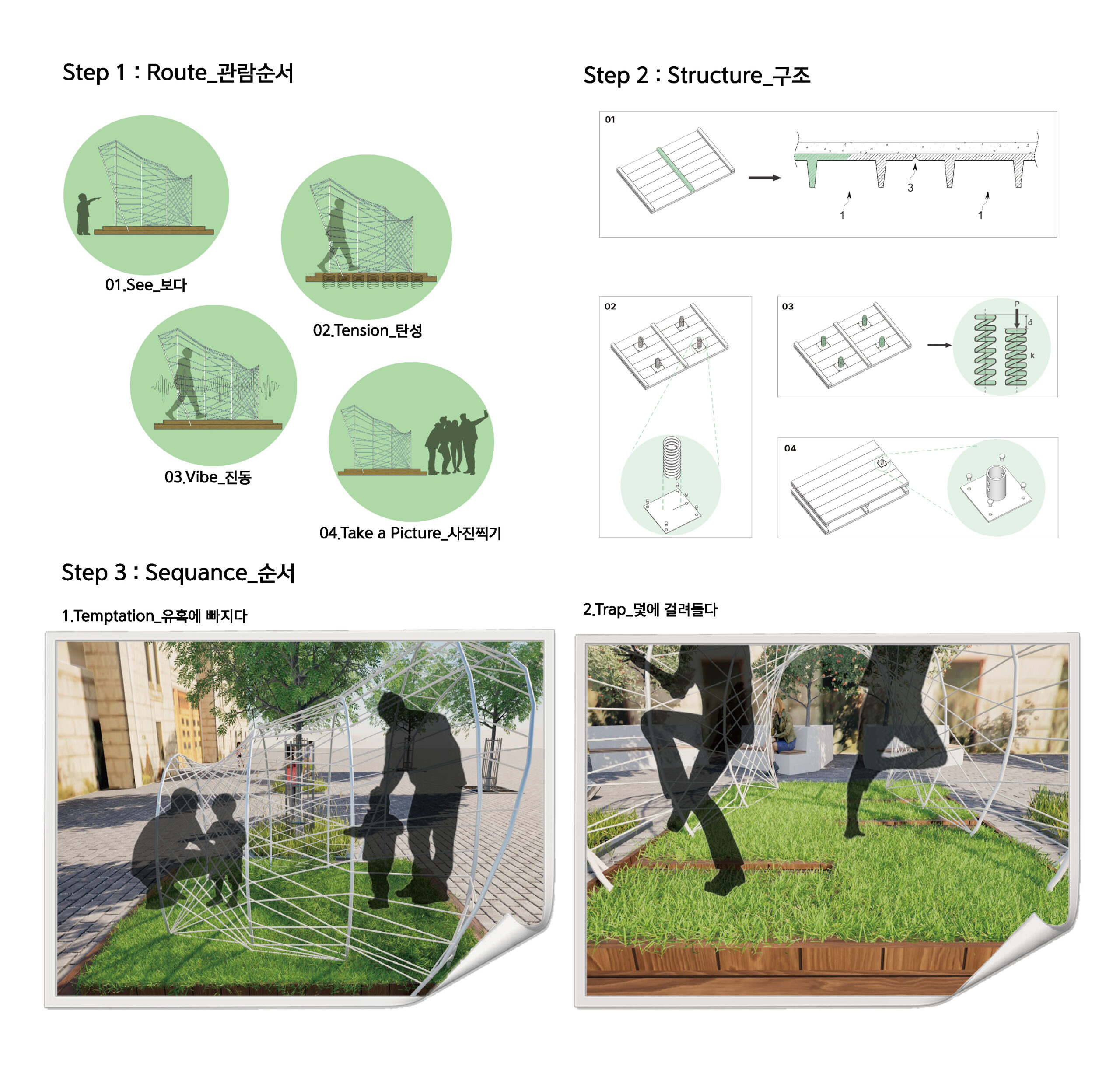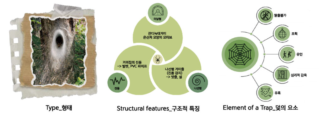 현대 사회에 깊게 뿌리내린 도박중독은 누구나 쉽게 빠질 수 있는 ‘보이지 않는 덫’입니다. 우리는 이 구조적 중독의 메커니즘을 자연 생태 속 한 생물, ‘잔디늑대거미’의 거미집에서 발견했습니다. 잔디늑대거미는 끈적임이 없는 보이지 않는 시트형 거미줄과 터널형 은신처를 함께 짓습니다. 이 시트 구조는 매우 미세한 진동에도 민감하게 반응하도록 진화했으며, 피식자는 자신이 덫에 걸린 줄도 모른 채 위를 지나가게 됩니다. 은신처에 숨어 있던 거미가 튀어나와 피식자를 포획합니다. 우리는 이 정교한 생태 구조를 건축적으로 재해석하여, 나선형 직조 방식을 적용한 파빌리온을 만들었습니다. 내부에는 불안정하게 흔들리는 발판을 설치해, 사용자가 마치 거미줄 위를 걷는 듯한 불안감과 긴장을 체험할 수 있도록 했습니다. 이는 단순한 공간 체험을 넘어, 자연이 만들어낸 섬세한 생존 전략과 인간의 행위를 연결 짓는 생체모방 디자인입니다. 이 파빌리온은 도박이라는 사회적 덫을 상징적으로 드러내며, 사용자로 하여금 인간의 행동과 생태적 사고를 동시에 성찰하게 합니다. 이 구조물은 기능과 형태, 메시지를 하나의 설계 언어로 통합한 건축적 실험입니다.