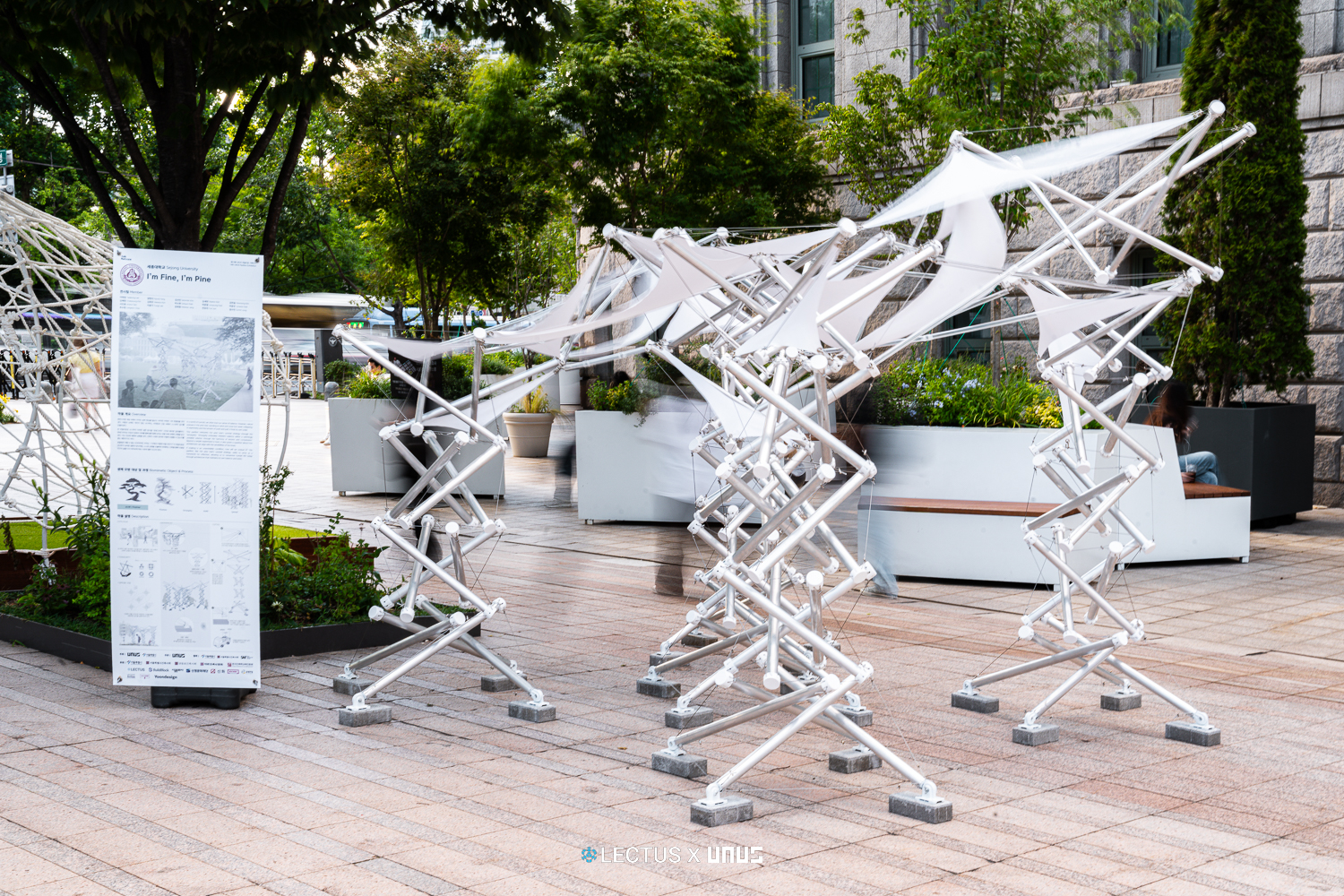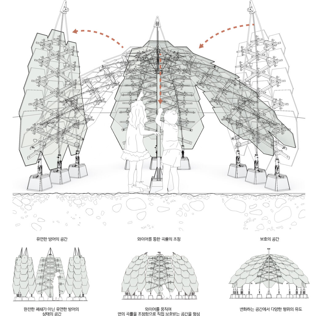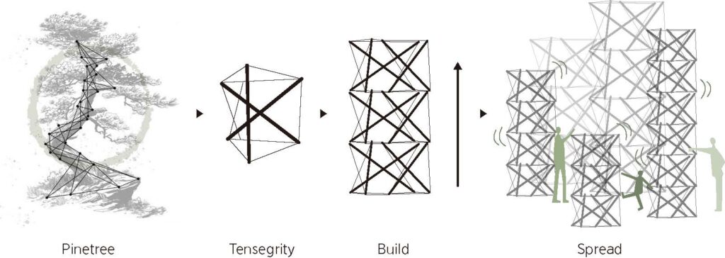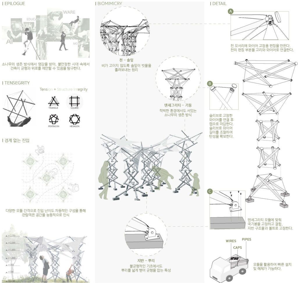 본 파빌리온은 소나무의 이러한 생존 방식을 ‘텐세그리티’ 구조로 해석한 결과물이다. 텐세그리티는 인장과 압축의 조화를 통해 불안정해 보이는 외형 속에 내재된 균형을 담고 있다. 이는 단순한 형태의 실험을 넘어, 건축이 시대의 정서와 어떻게 호흡할 수 있는지를 묻는 제안이기도 하다.