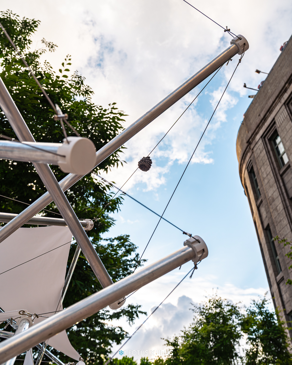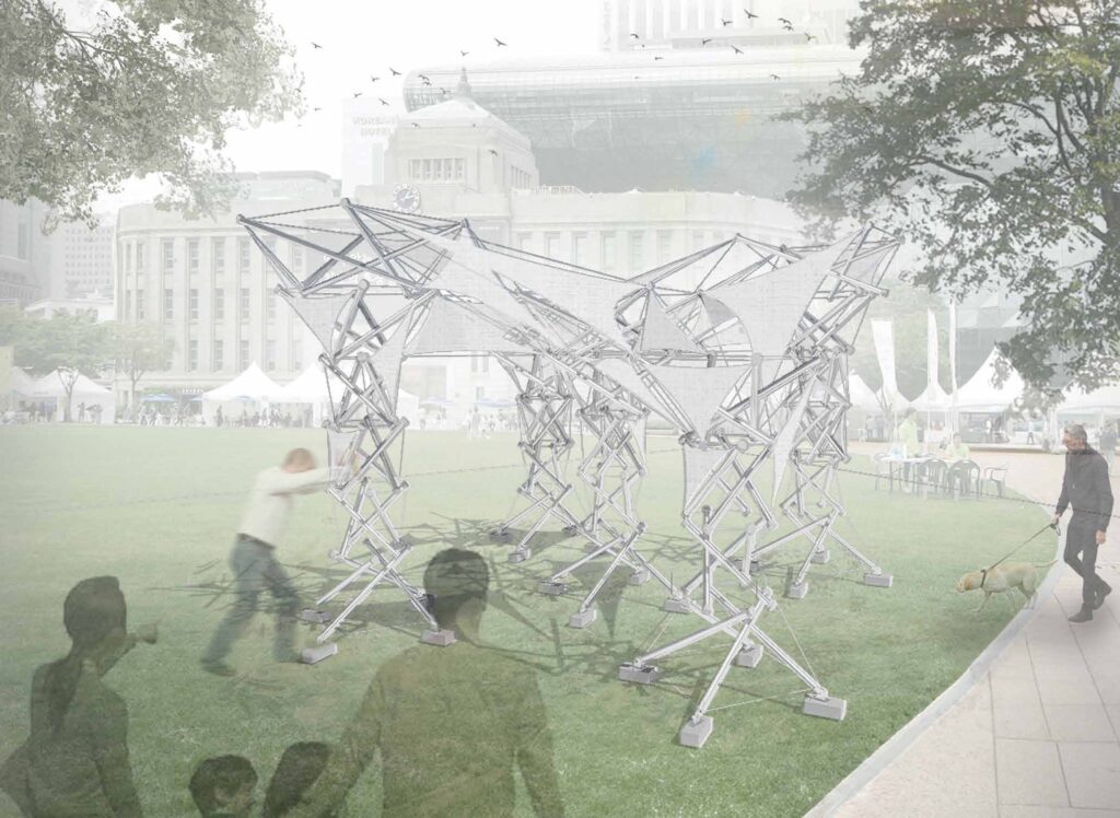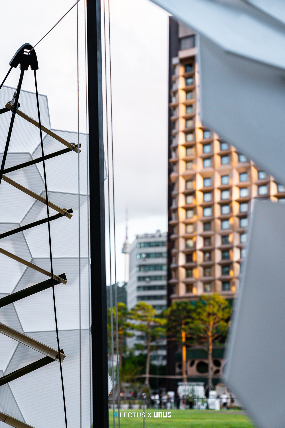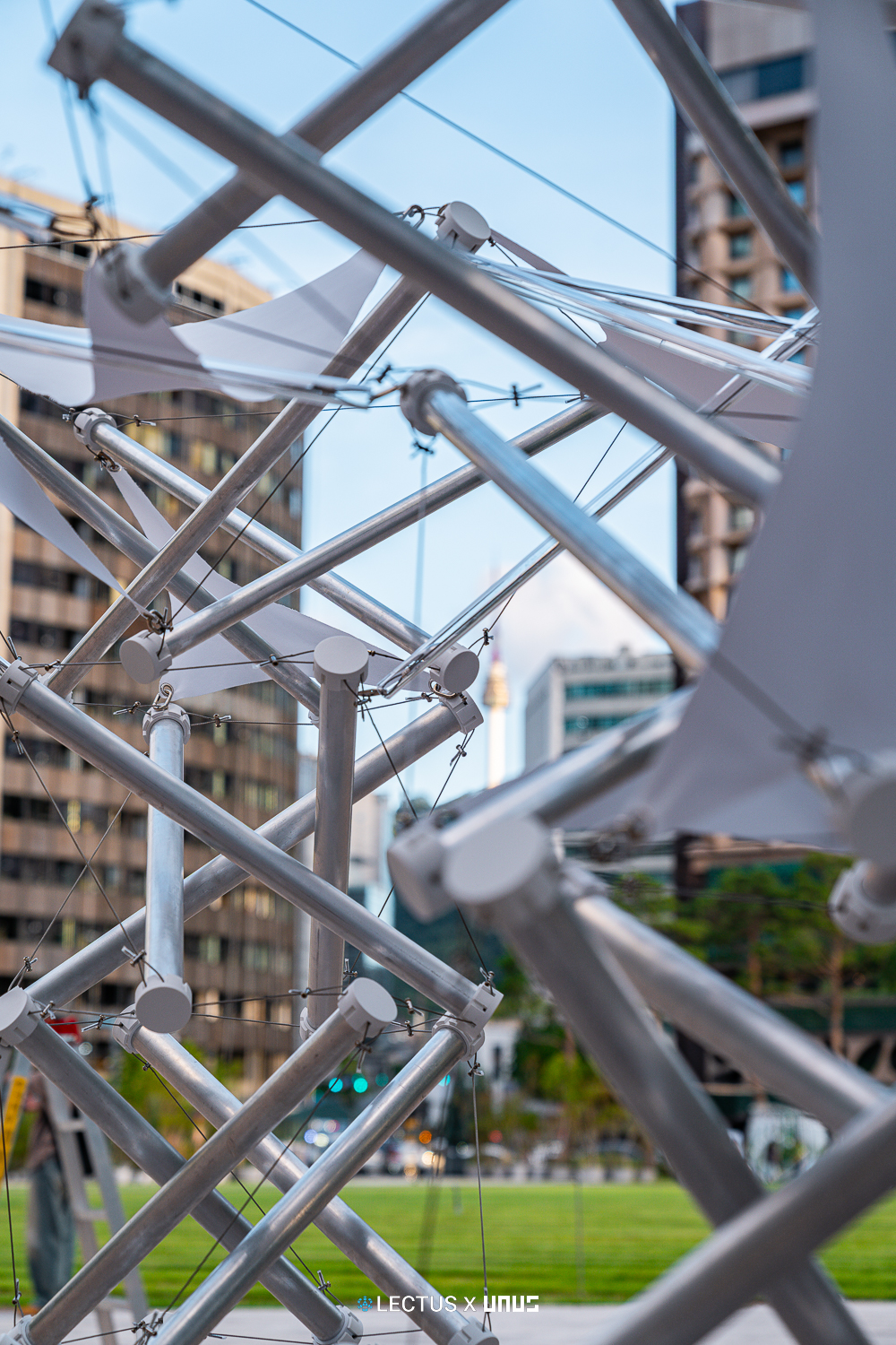 본 파빌리온은 소나무의 이러한 생존 방식을 ‘텐세그리티’ 구조로 해석한 결과물이다. 텐세그리티는 인장과 압축의 조화를 통해 불안정해 보이는 외형 속에 내재된 균형을 담고 있다. 이는 단순한 형태의 실험을 넘어, 건축이 시대의 정서와 어떻게 호흡할 수 있는지를 묻는 제안이기도 하다.