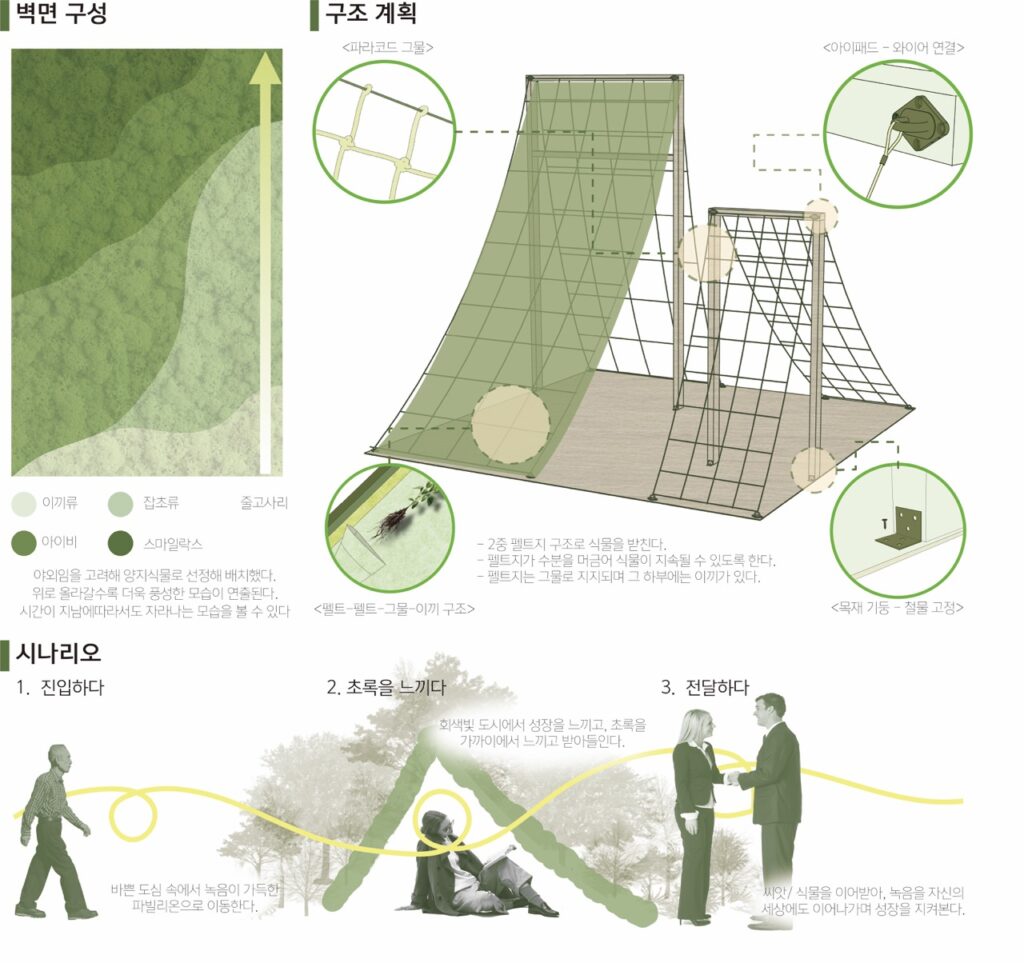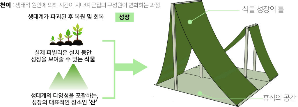 파빌리온은 도시의 회색 일상 속에서 잊고 지낸 자연의 감각을 일깨운다. 이는 인간과 자연, 도시와 생태계가 다시 연결되기 위한 작은 시도이자, 도시 한복판에 멈췄던 생명의 흐름을 다시 잇는 회복의 시작점이 된다.