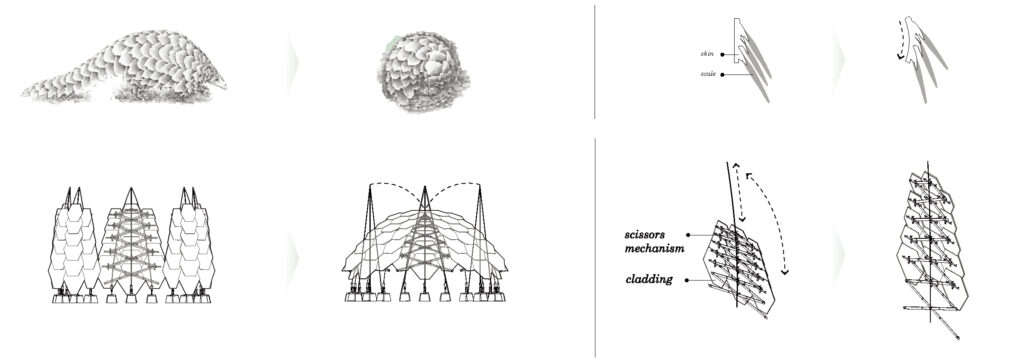 신체를 넘어, 감정과 감각까지도 외부 자극으로부터 보호받아야 한다. 우리는 이러한 시대적 정서에 대한 해답을 자연에서 찾는다. 천산갑은 여타 포유류와 달리 단단한 비늘이 온 몸을 덮고 있다. 이 비늘들은 천산갑의 움직임에 유연하게 대응한다. 천산갑은 위협을 감지하면 몸을 둥글게 말아 비늘로 온몸을 감싼다. 이 방어 메커니즘을 모방하여 물리적·심리적인 ‘웅크림’이 가능한 쉘터를 제안한다.