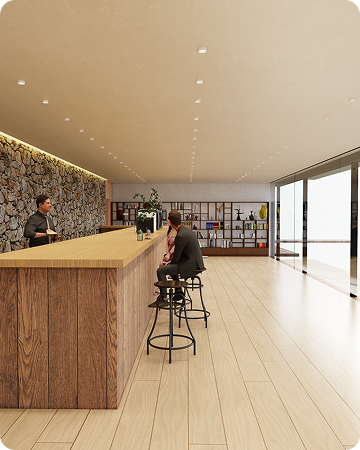 조명과 재질의 디테일한 설정을 통해 실사 수준의 공간을 구현합니다.