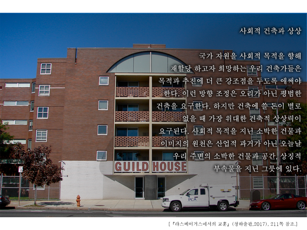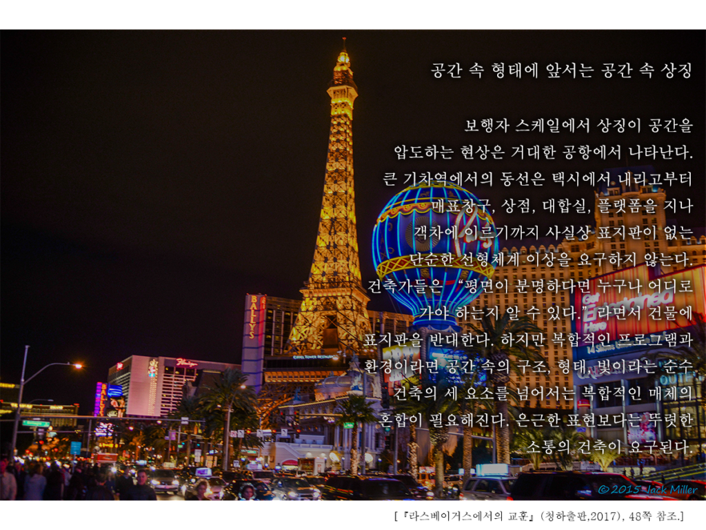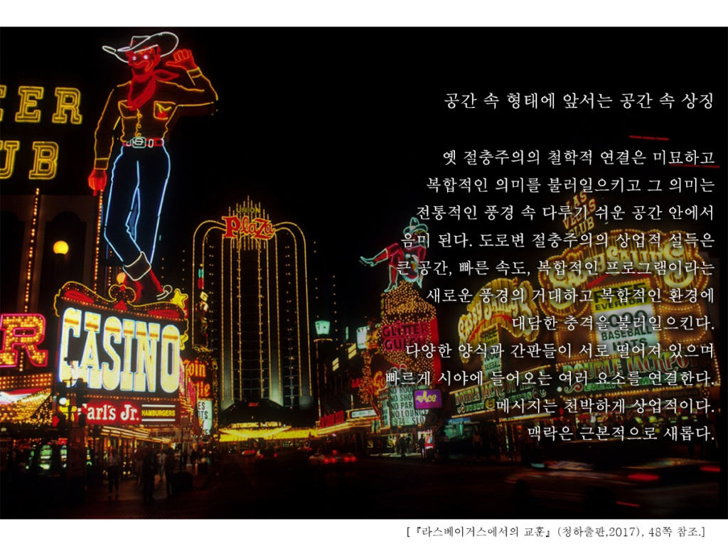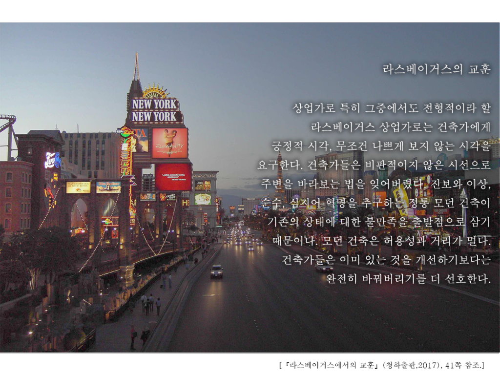 벤투리는 라스베이거스의 상업 가를 새롭게 바라봅니다. 모더니즘에서는 대척점에 서 있는, 상업적이고, 장식이 난무하는 그 거리를 긍정적인 방향으로 분석하기 시작합니다. 그는 그곳에서 어떤 교훈을 얻었을까요?