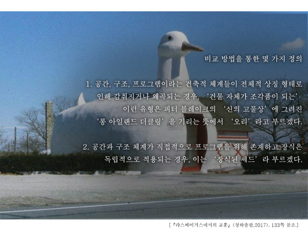 그는 이 책에서, 포스트모더니즘과 모더니즘을 명확히 구분하고, 비판하기보다는, 대체어를 사용하여 그것을 비교하며 어느 부분이 다른지, 어떤 변화가 일어났는지, 일어나야 하는지를 설명합니다. 상징과 장식을 미묘하고 직접적이지 않게 표현하고자 했지만, 그 자체로 상징물이 되어버린 모순에 빠진 모더니즘의 건물들을 오리로, 보다 조형적이진 않지만, 실용적이고 평범하지만 나름의 아름다움이 있는 포스트모더니즘의 형태를 장식된 셰드로 제시합니다.